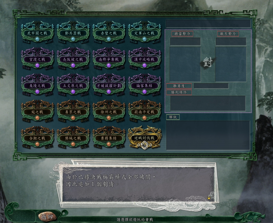 威力加强版则新增了“决战称霸模式”,相当于短平快的小型剧本,按难度分划20个关卡,大部分关卡都弱化运营要素,固定敌我的武将和兵力配置,注重剧情推演,要求玩家把能应用的战术发挥到极致。