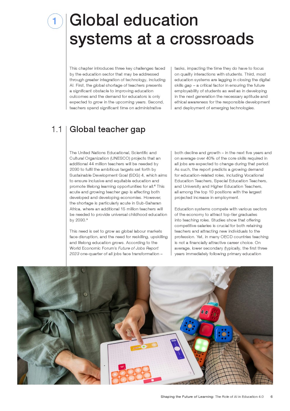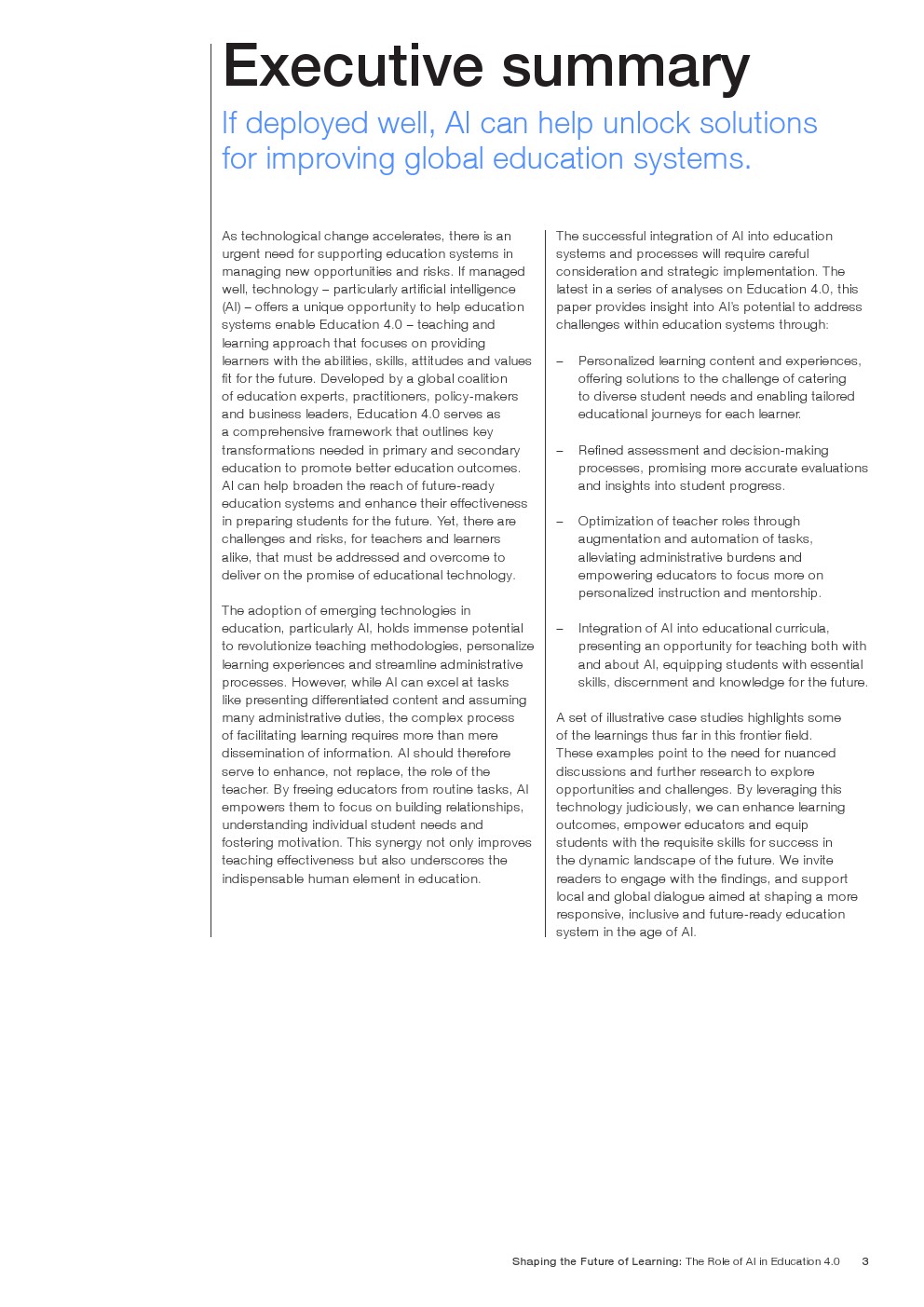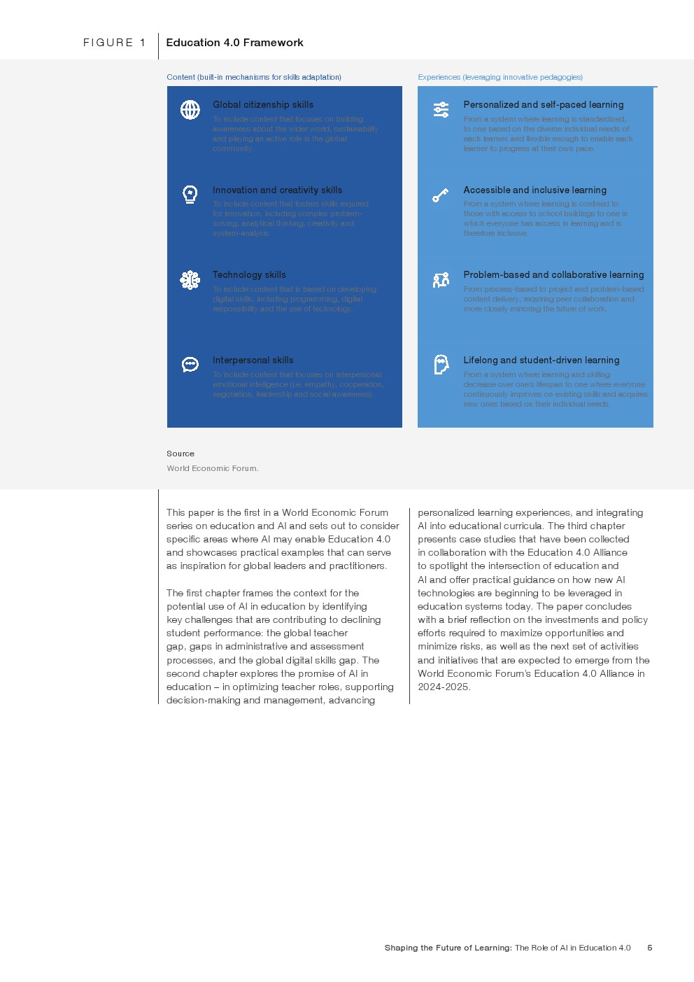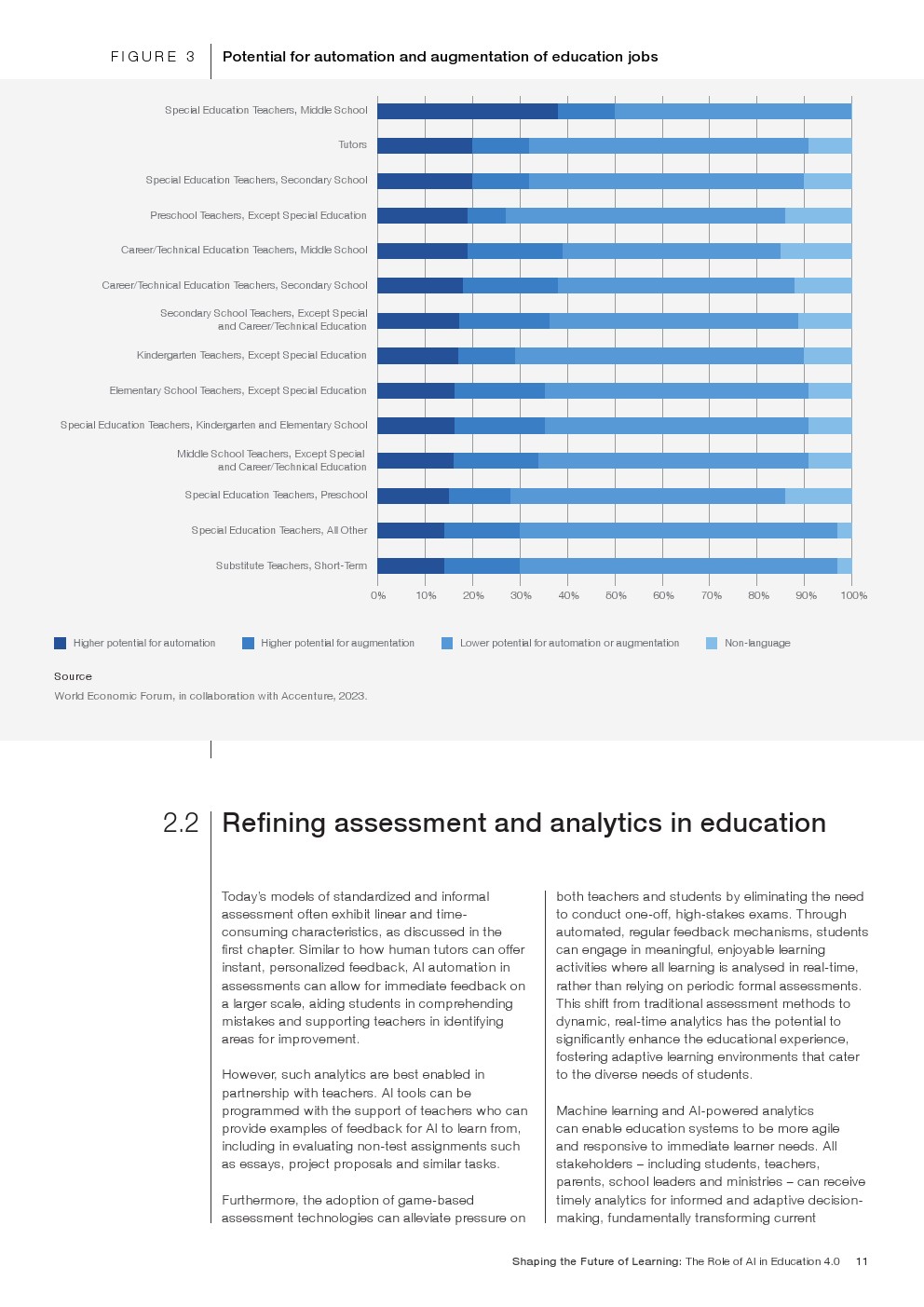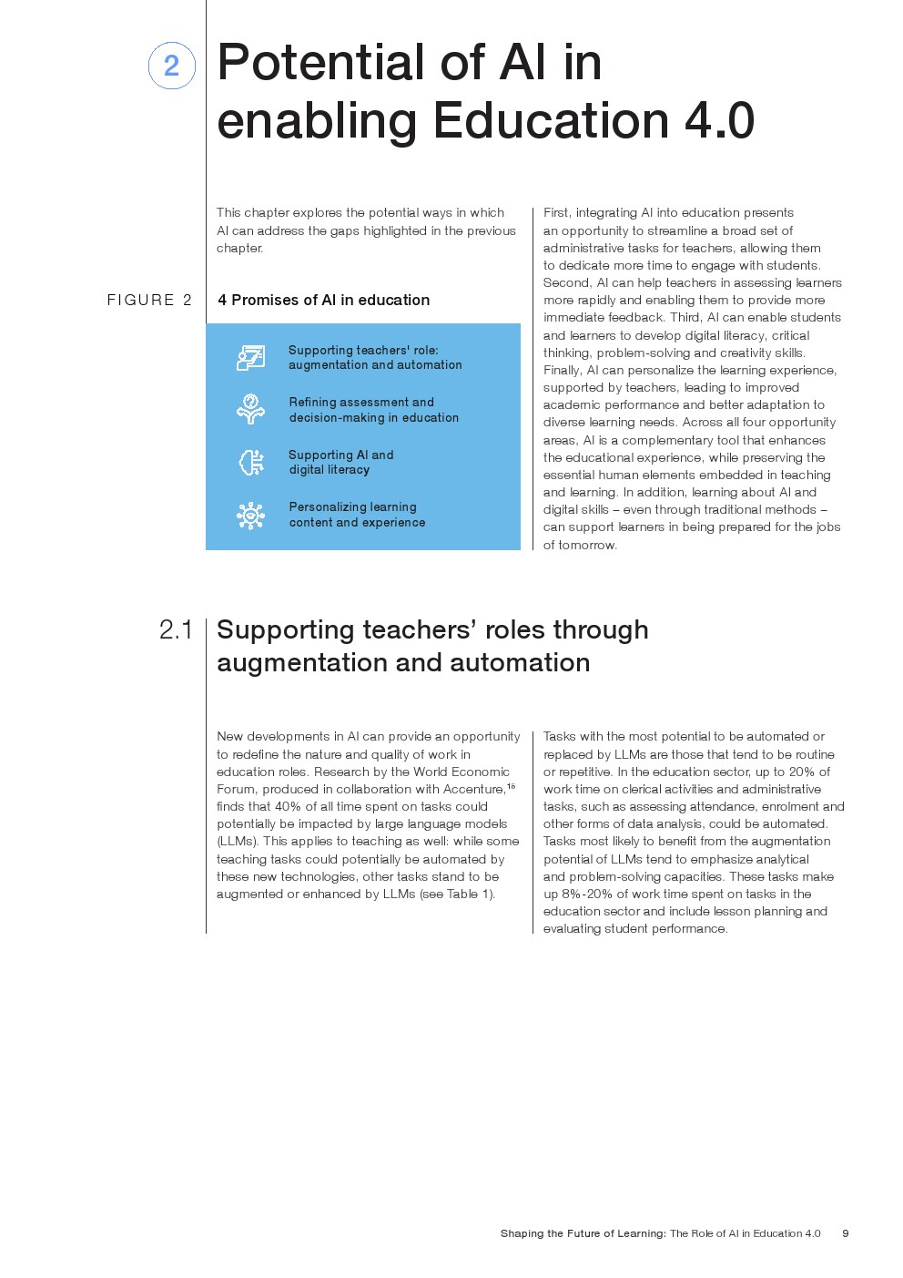 随着技术变革的加速,迫切需要支持教育系统管理新的机遇和风险。如果管理得当,技术为帮助教育系统实现教育4.0提供了一个独特的机会。教育4.0是一种专注于为学习者提供适合未来的能力、技能、态度和价值观的教学方法。“教育4.0”是由全球教育专家、从业者、政策制定者和商界领袖组成的联盟制定的,它是一个全面的框架,概述了中小学教育为促进更好的教育成果所需的关键变革。人工智能可以帮助扩大面向未来的教育系统的覆盖范围,并提高其为学生未来做好准备的有效性。对于教师和学习者来说,都存在挑战和风险,必须解决和克服这些挑战和风险,以实现教育技术的承诺。