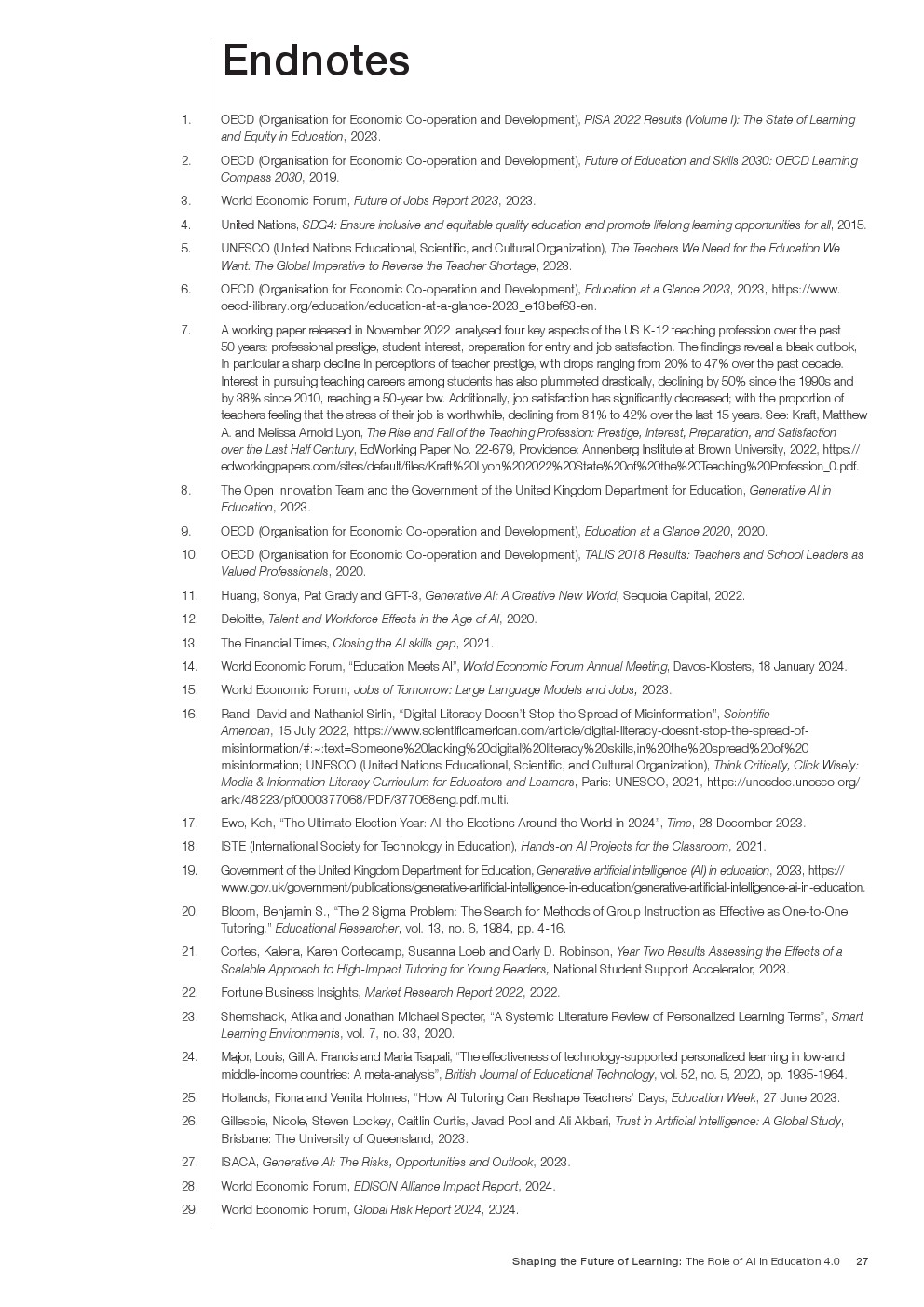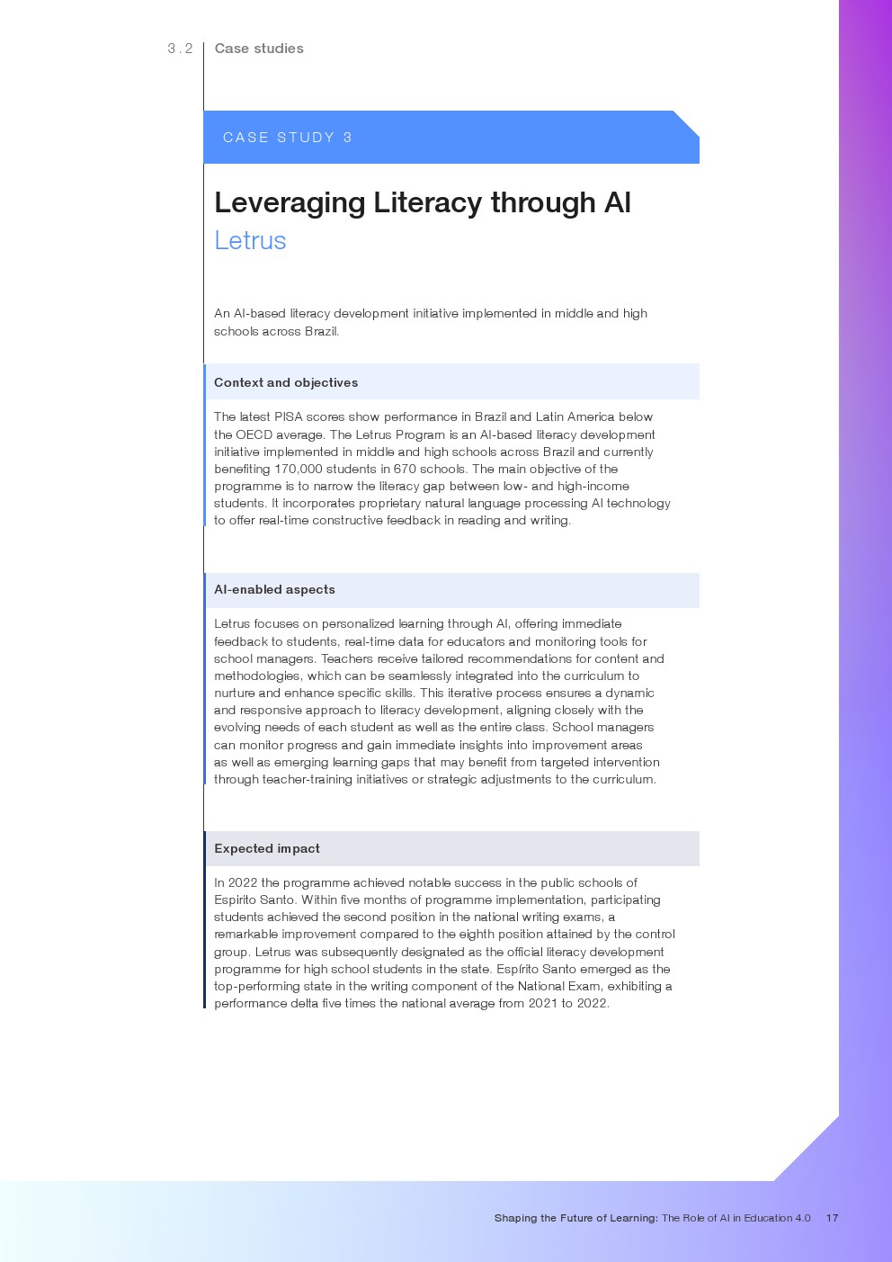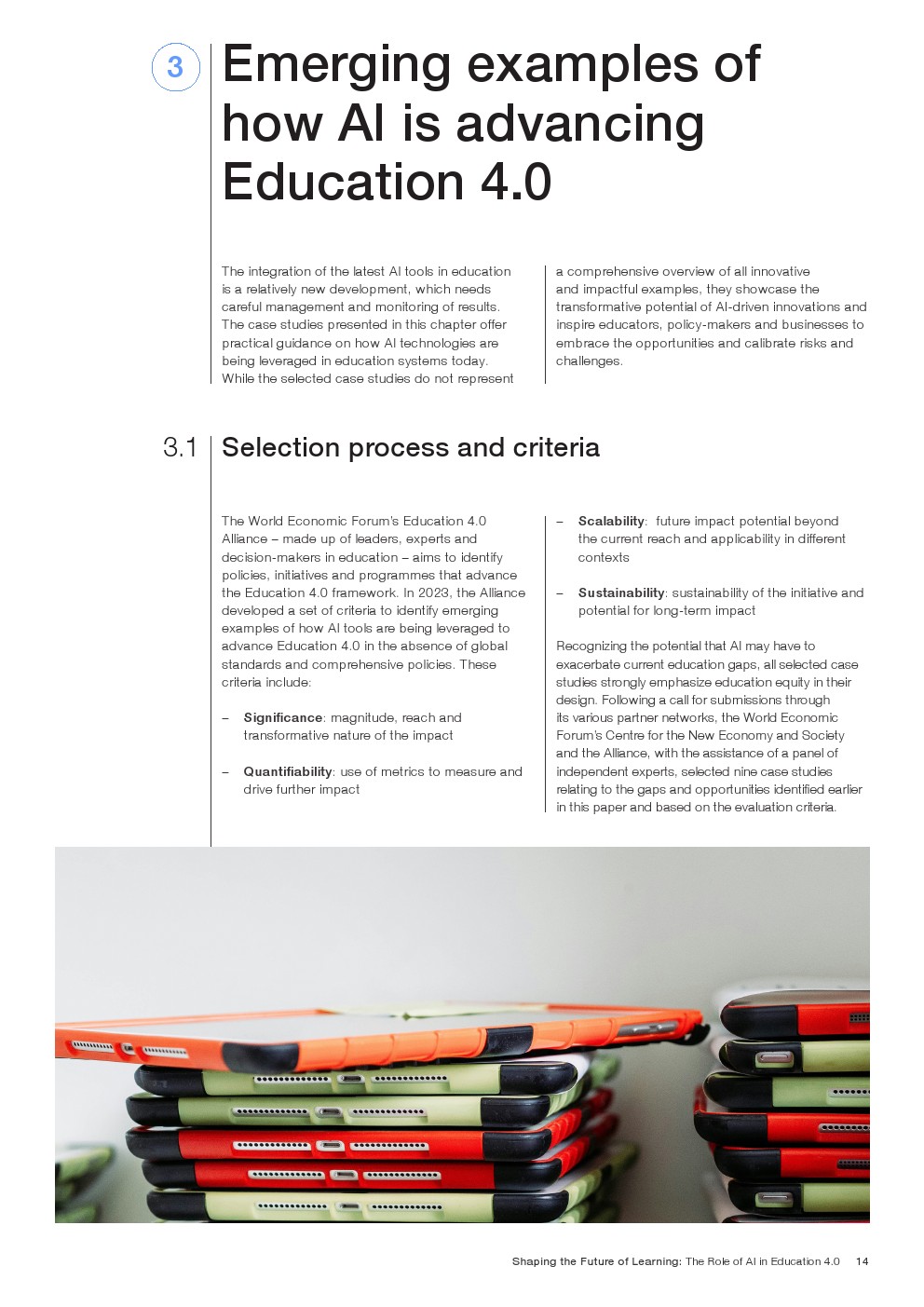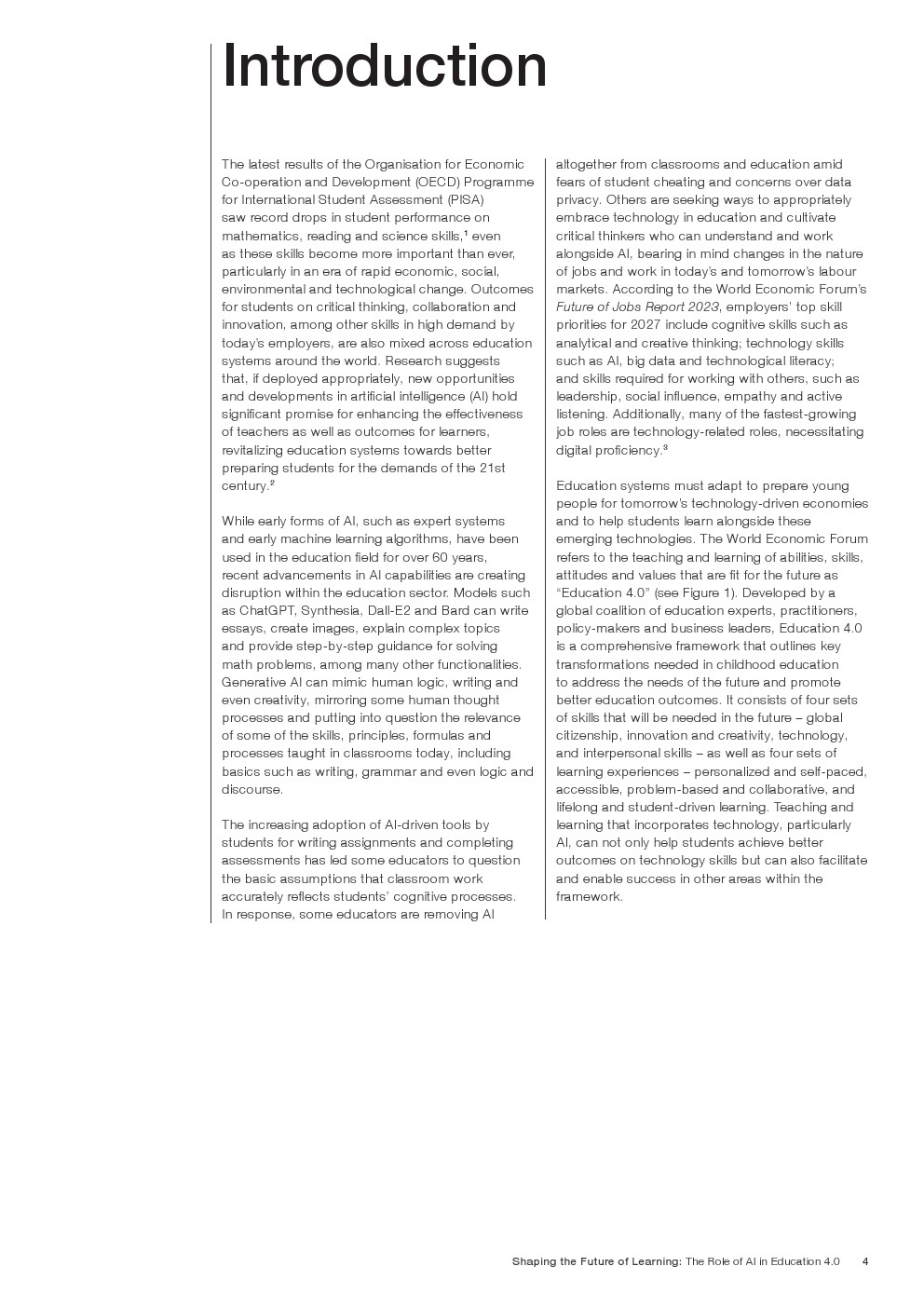 随着技术变革的加速,迫切需要支持教育系统管理新的机遇和风险。如果管理得当,技术为帮助教育系统实现教育4.0提供了一个独特的机会。教育4.0是一种专注于为学习者提供适合未来的能力、技能、态度和价值观的教学方法。“教育4.0”是由全球教育专家、从业者、政策制定者和商界领袖组成的联盟制定的,它是一个全面的框架,概述了中小学教育为促进更好的教育成果所需的关键变革。人工智能可以帮助扩大面向未来的教育系统的覆盖范围,并提高其为学生未来做好准备的有效性。对于教师和学习者来说,都存在挑战和风险,必须解决和克服这些挑战和风险,以实现教育技术的承诺。