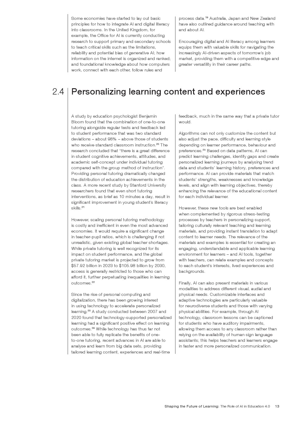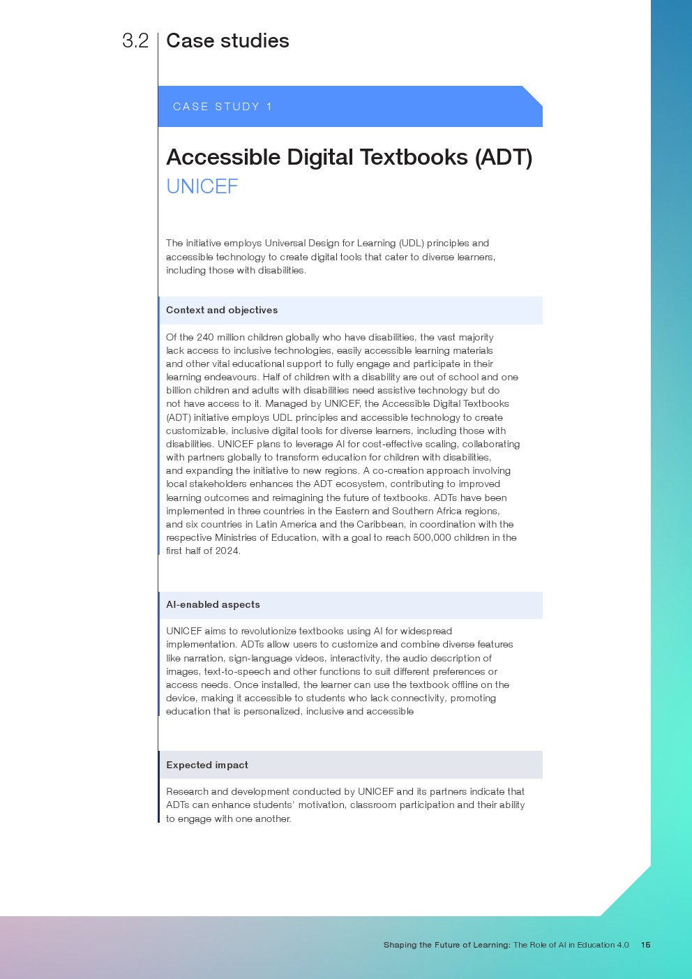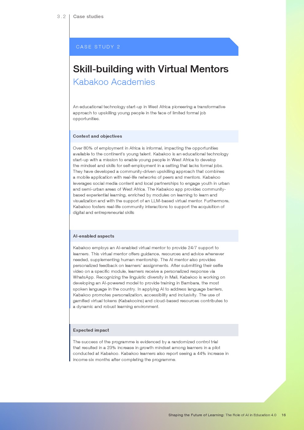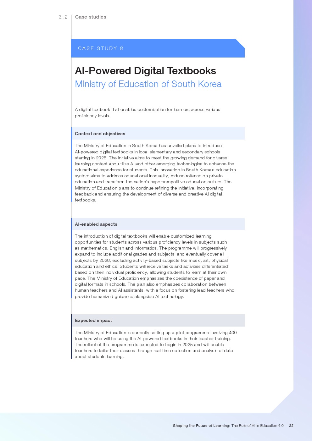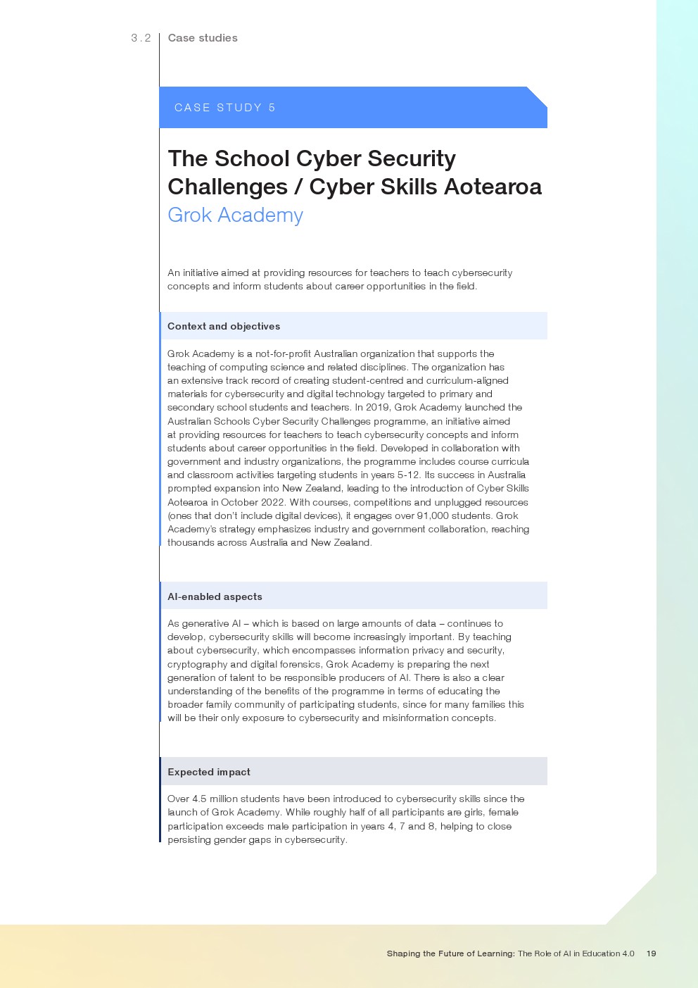 随着技术变革的加速,迫切需要支持教育系统管理新的机遇和风险。如果管理得当,技术为帮助教育系统实现教育4.0提供了一个独特的机会。教育4.0是一种专注于为学习者提供适合未来的能力、技能、态度和价值观的教学方法。“教育4.0”是由全球教育专家、从业者、政策制定者和商界领袖组成的联盟制定的,它是一个全面的框架,概述了中小学教育为促进更好的教育成果所需的关键变革。人工智能可以帮助扩大面向未来的教育系统的覆盖范围,并提高其为学生未来做好准备的有效性。对于教师和学习者来说,都存在挑战和风险,必须解决和克服这些挑战和风险,以实现教育技术的承诺。