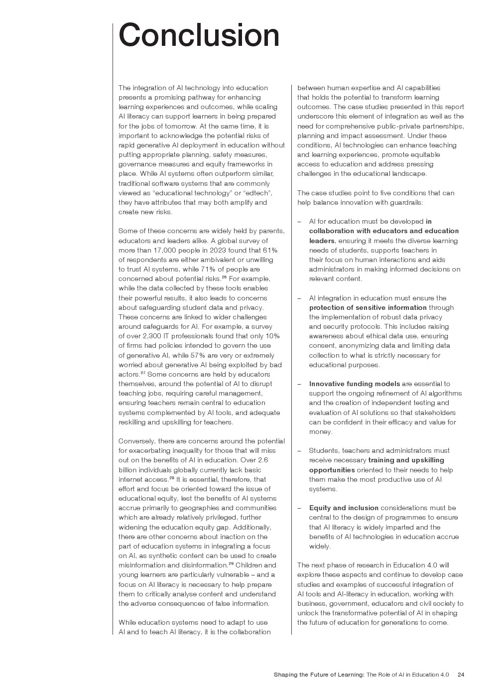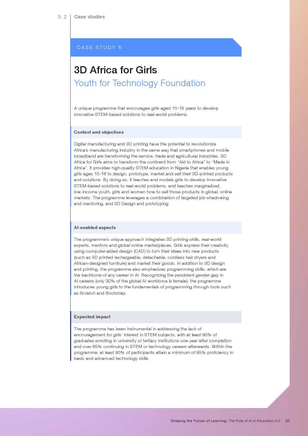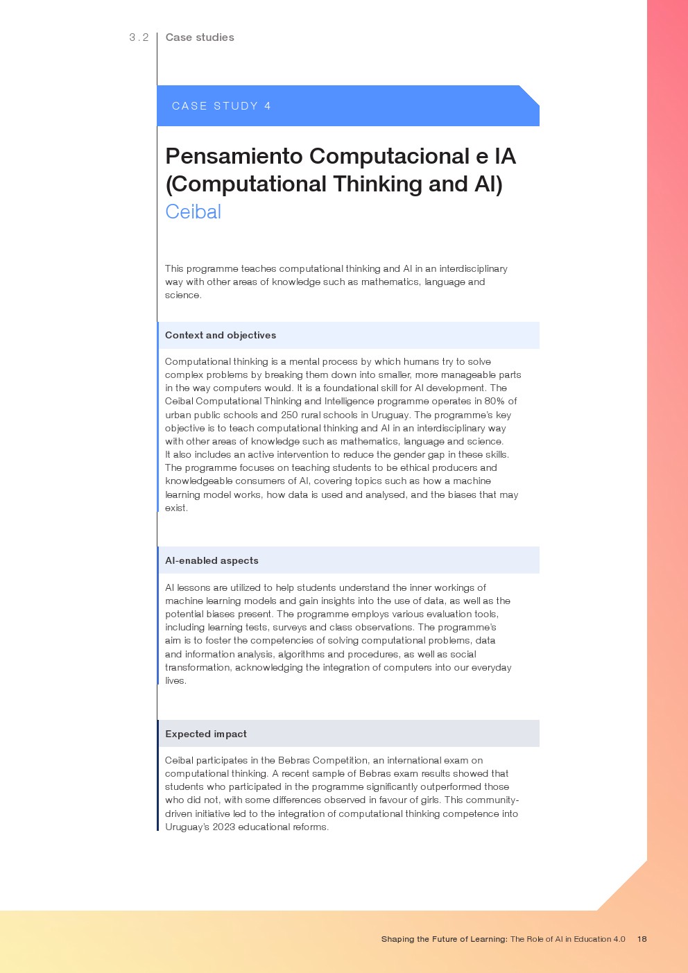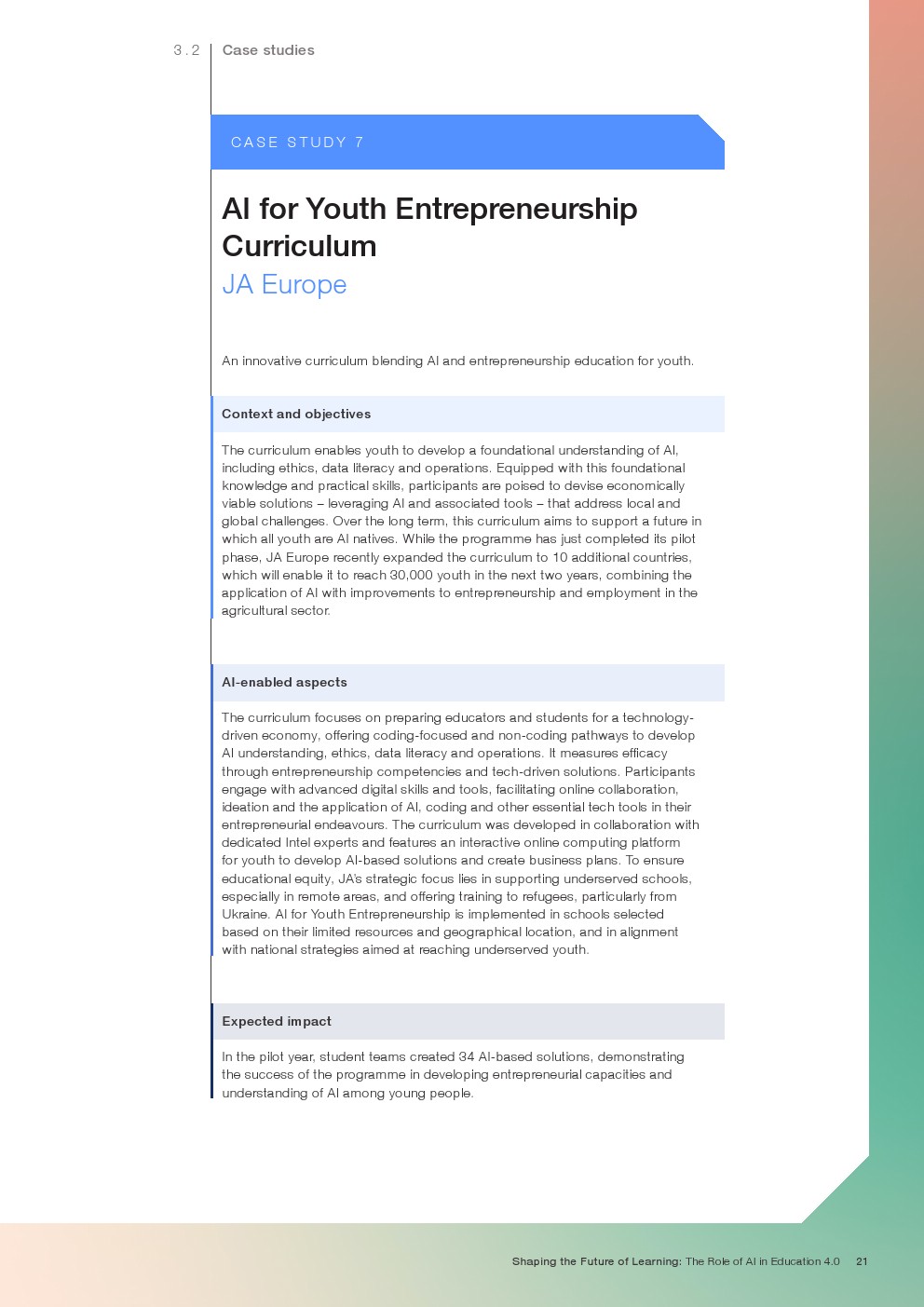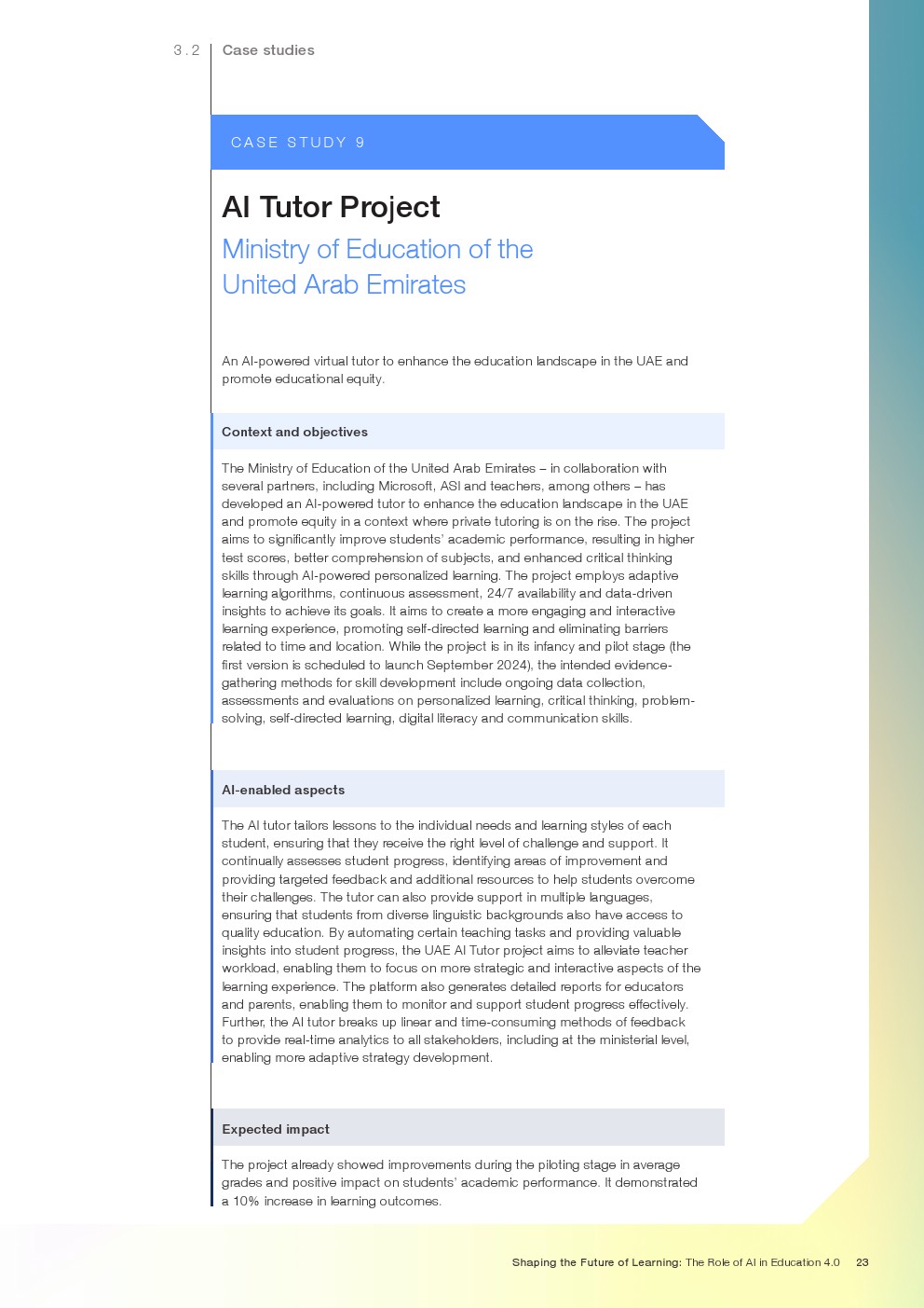 随着技术变革的加速,迫切需要支持教育系统管理新的机遇和风险。如果管理得当,技术为帮助教育系统实现教育4.0提供了一个独特的机会。教育4.0是一种专注于为学习者提供适合未来的能力、技能、态度和价值观的教学方法。“教育4.0”是由全球教育专家、从业者、政策制定者和商界领袖组成的联盟制定的,它是一个全面的框架,概述了中小学教育为促进更好的教育成果所需的关键变革。人工智能可以帮助扩大面向未来的教育系统的覆盖范围,并提高其为学生未来做好准备的有效性。对于教师和学习者来说,都存在挑战和风险,必须解决和克服这些挑战和风险,以实现教育技术的承诺。