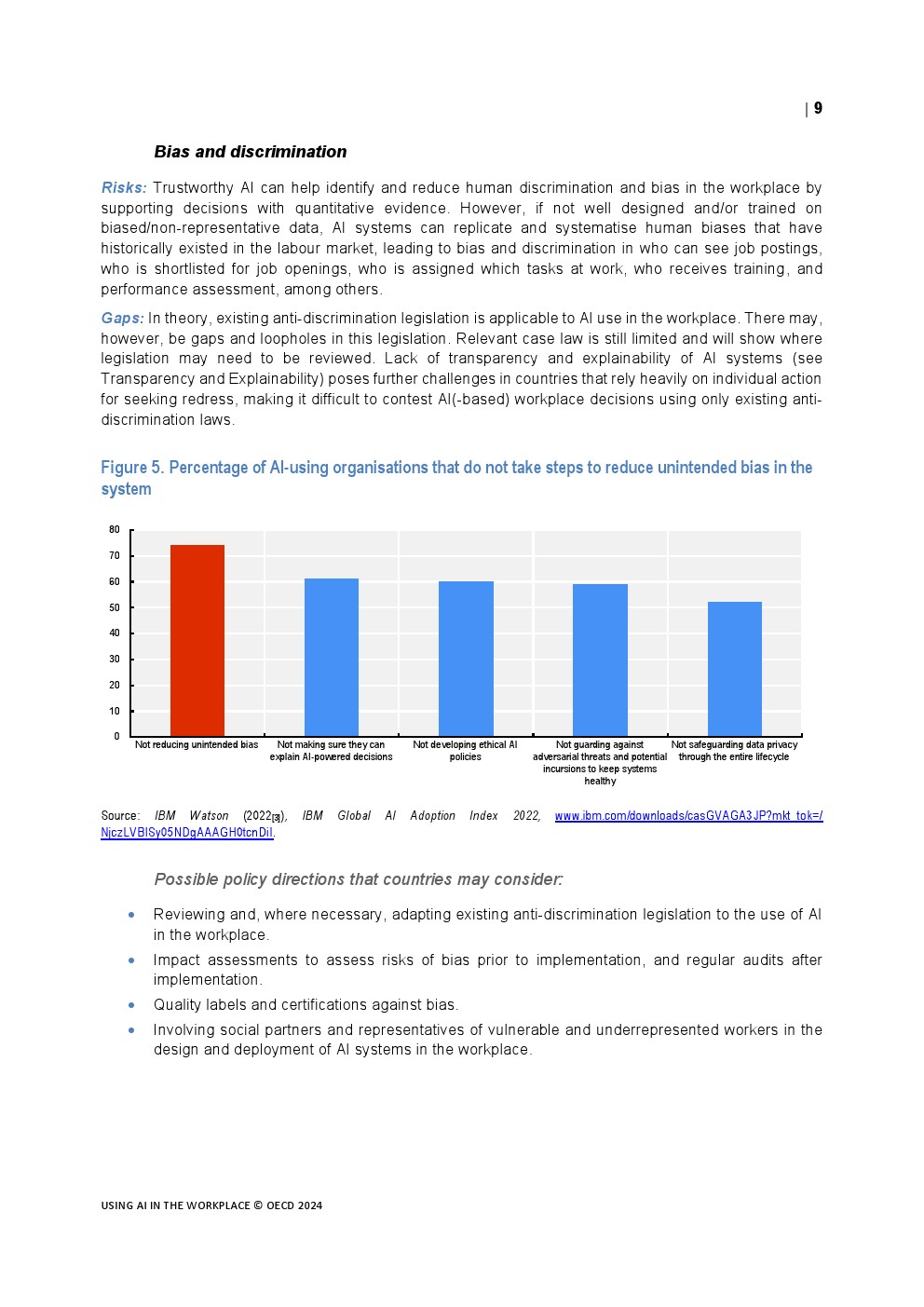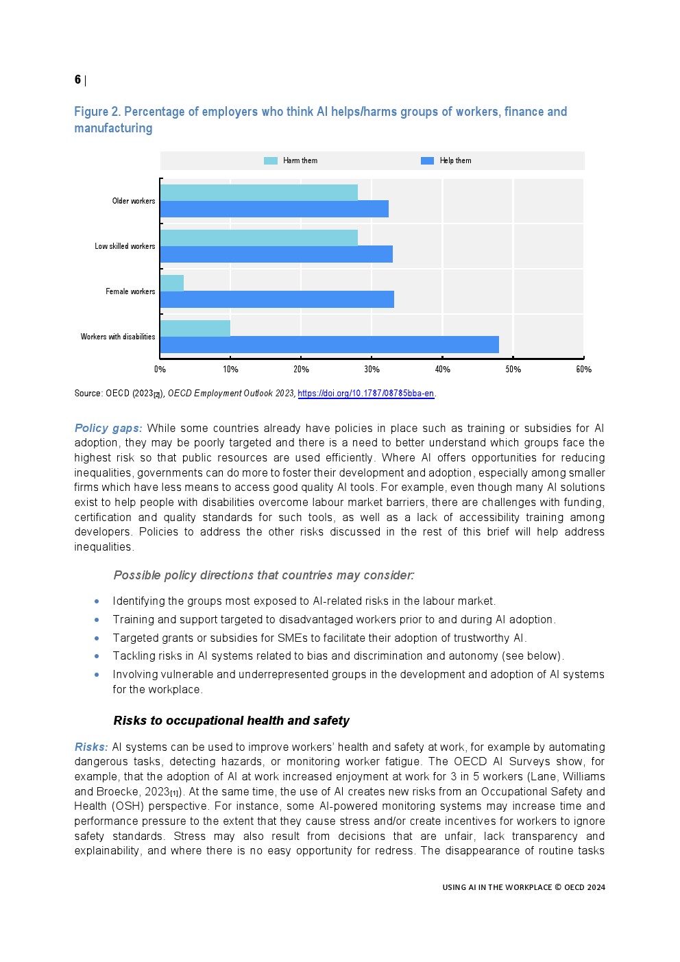 人工智能可以给工作场所带来巨大的好处。在经合组织的人工智能调查中,4/5的员工表示人工智能提高了他们的工作表现,3/5的人表示人工智能增加了他们的工作乐趣。工人们也积极看待人工智能对他们身心健康的影响,以及它在决策中的有用性。不投资人工智能,不在工作场所采用人工智能,将错失提高生产力和提高工作质量等机会。在工作场所获取和使用人工智能的不平等可能导致公司和工人之间以及国家之间的差距扩大。