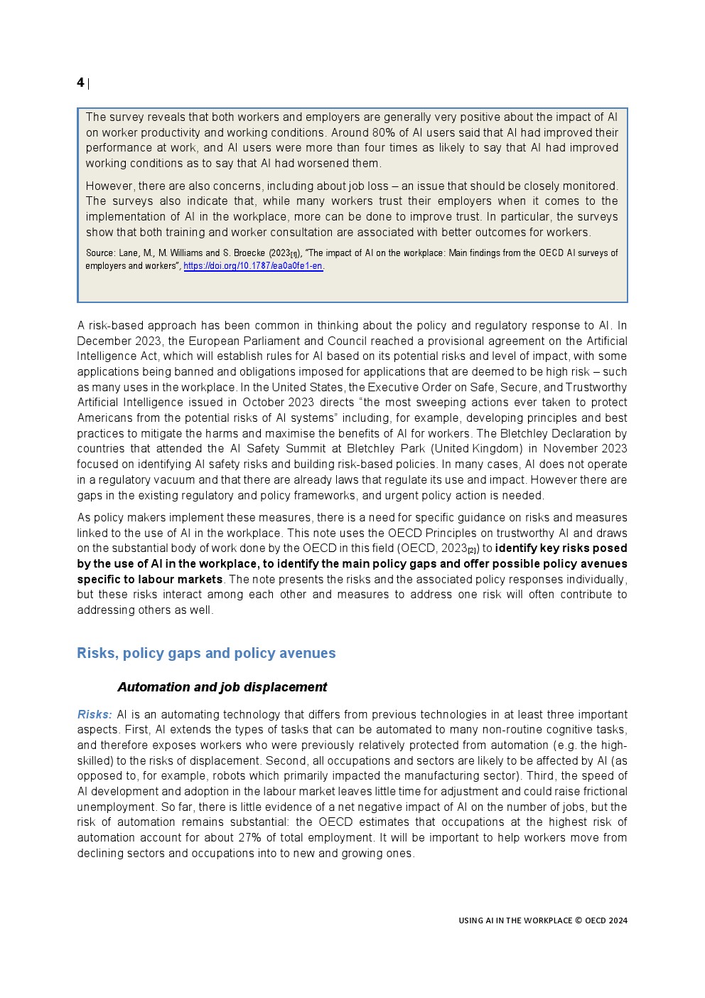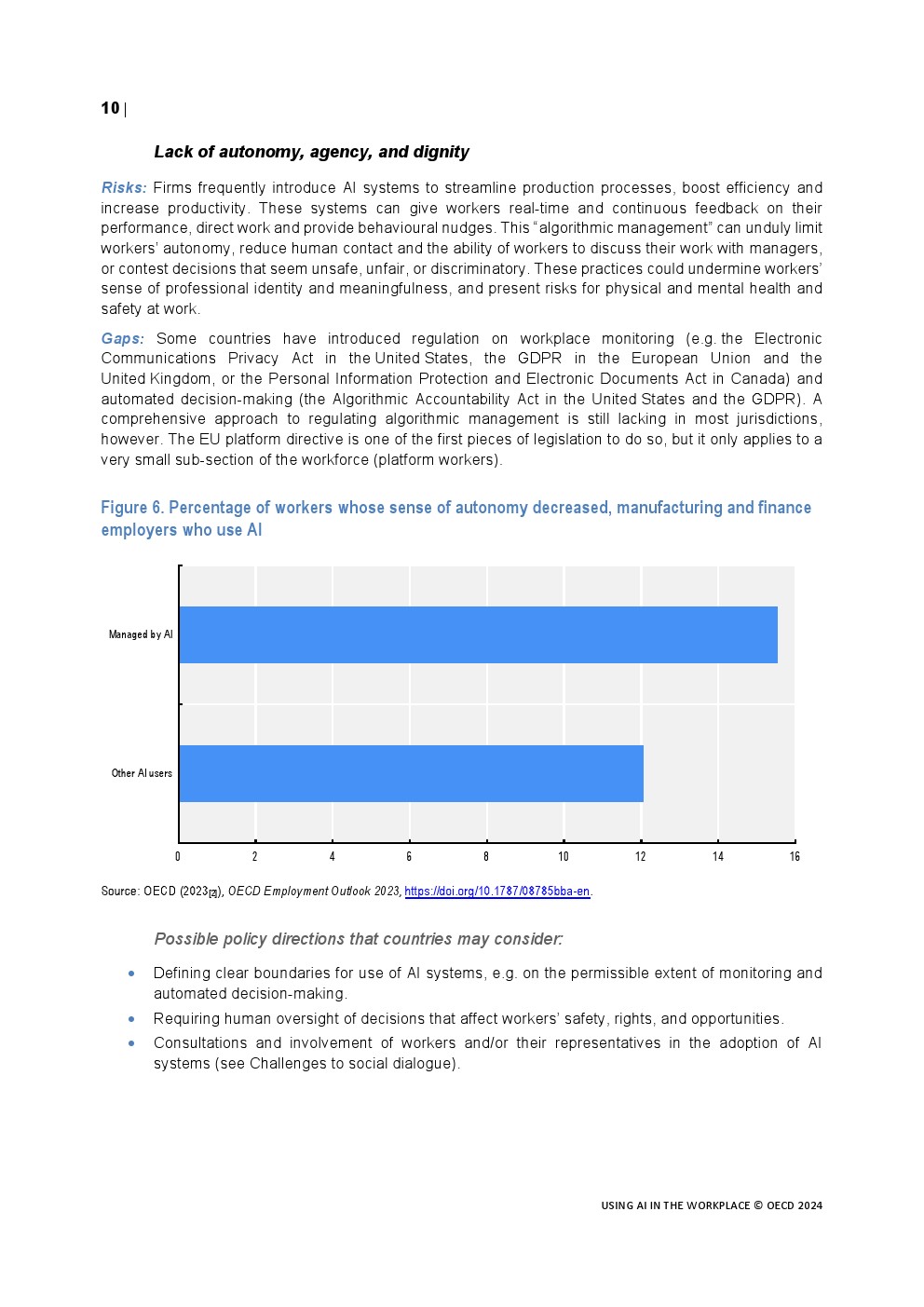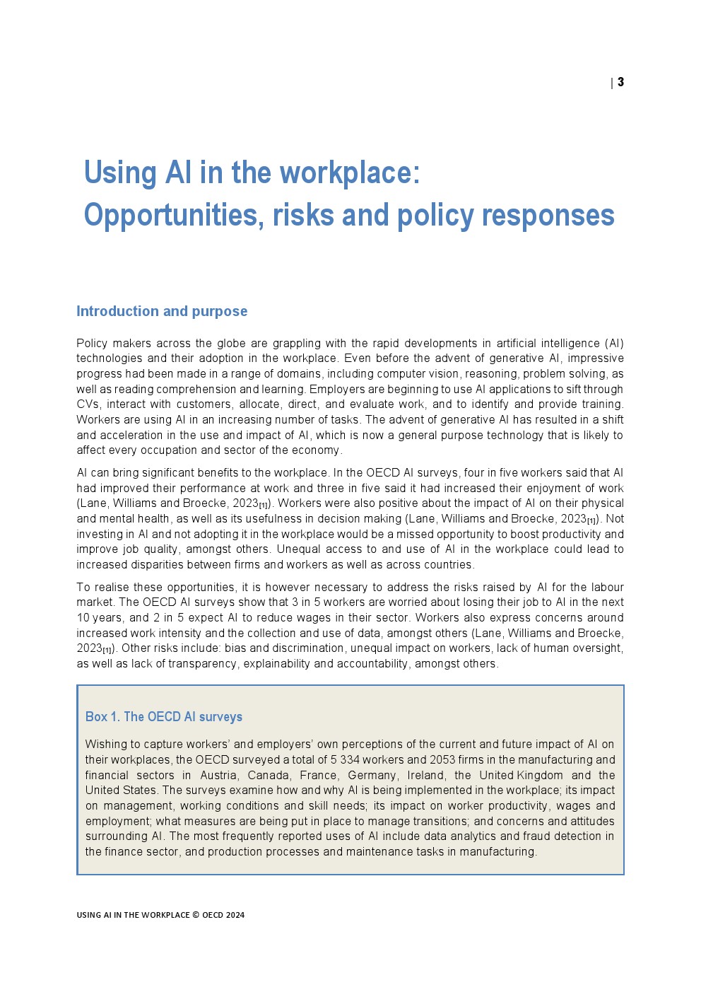 全球的政策制定者都在努力应对人工智能技术的快速发展及其在工作场所的应用。甚至在生成式人工智能出现之前,在计算机视觉、推理、解决问题以及阅读理解和学习等一系列领域已经取得了令人印象深刻的进展。雇主开始使用人工智能应用程序筛选简历、与客户互动、分配、指导和评估工作,以及识别和提供培训。工人们在越来越多的任务中使用人工智能。生成式人工智能的出现导致了人工智能的使用和影响的转变和加速,人工智能现在是一种通用技术,可能会影响到每一个职业和经济部门。