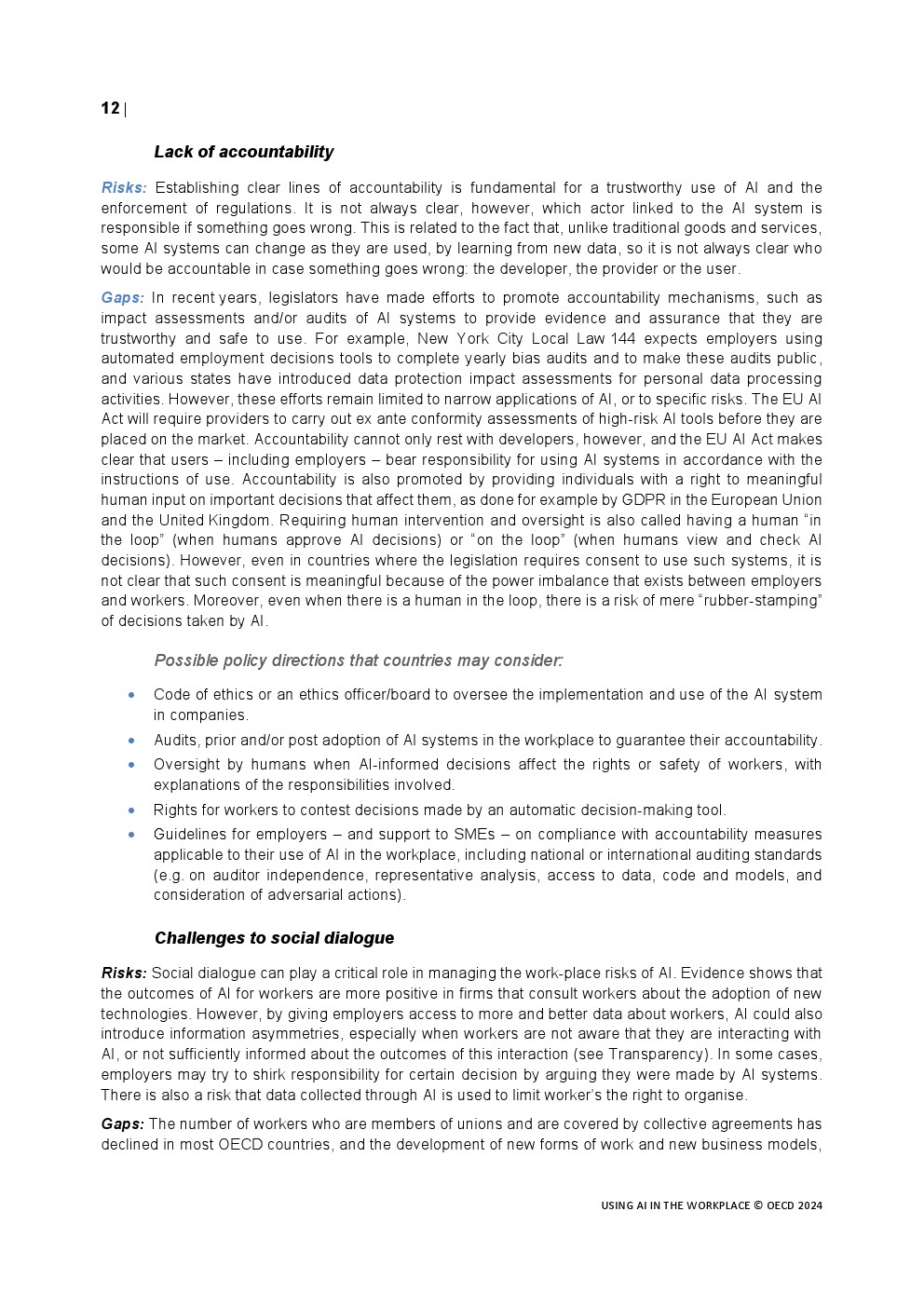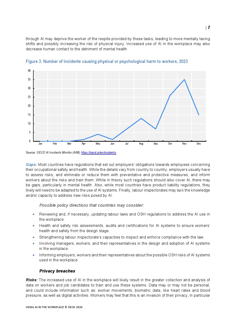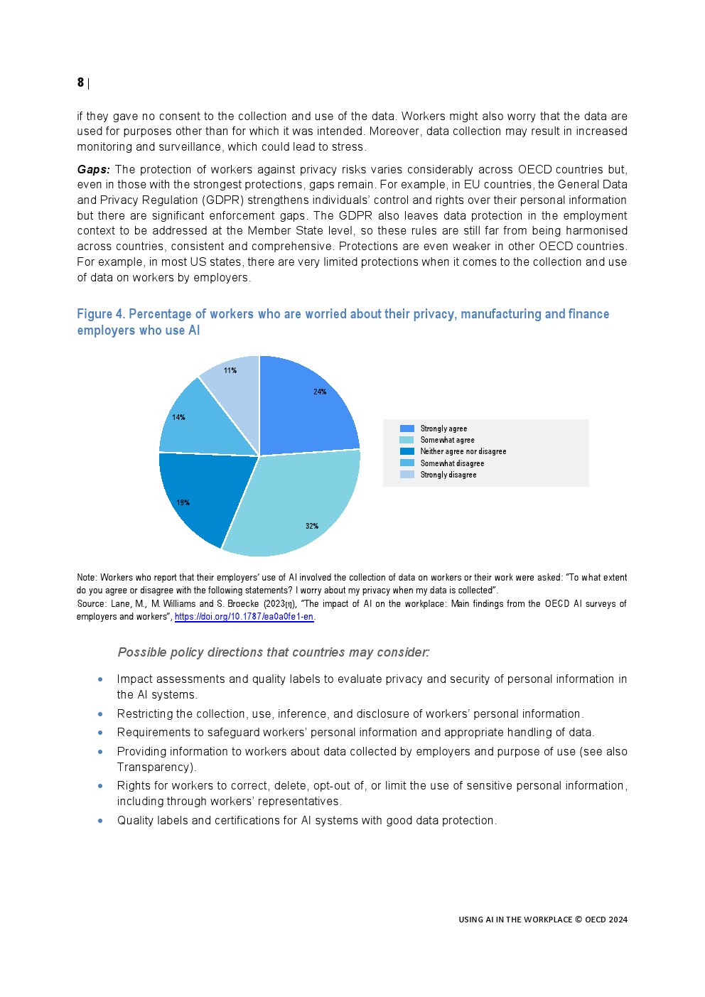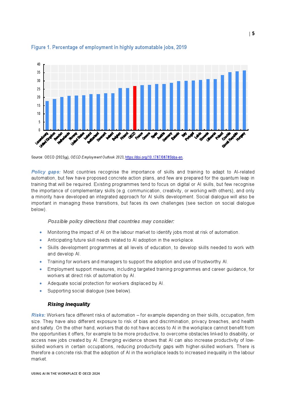 全球的政策制定者都在努力应对人工智能技术的快速发展及其在工作场所的应用。甚至在生成式人工智能出现之前,在计算机视觉、推理、解决问题以及阅读理解和学习等一系列领域已经取得了令人印象深刻的进展。雇主开始使用人工智能应用程序筛选简历、与客户互动、分配、指导和评估工作,以及识别和提供培训。工人们在越来越多的任务中使用人工智能。生成式人工智能的出现导致了人工智能的使用和影响的转变和加速,人工智能现在是一种通用技术,可能会影响到每一个职业和经济部门。