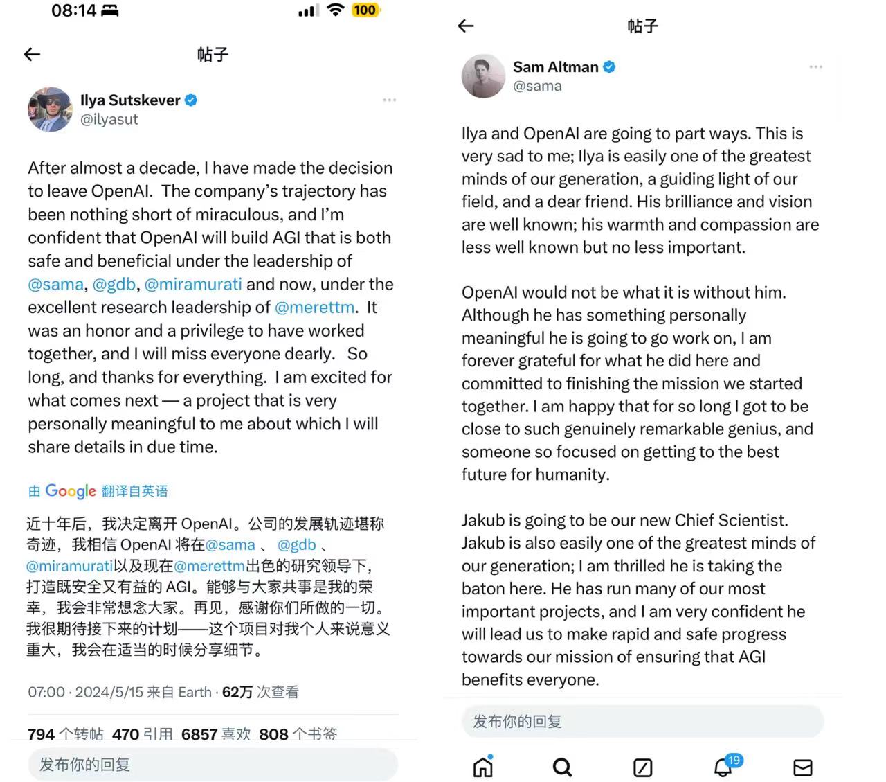 北京时间5月15日早上7点,OpenAI联创Ilya Sutskever在社交平台上发文表示,决定离开OpneAI。