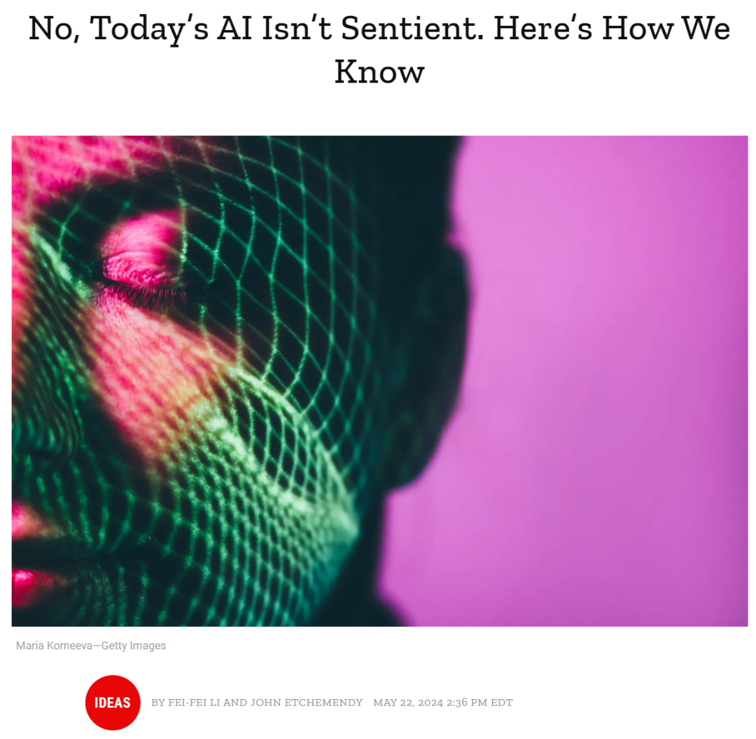 近日,李飞飞连同斯坦福大学以人为本人工智能研究所 HAI 联合主任 John Etchemendy 教授联合撰写了一篇文章,文章对 AI 到底有没有感觉能力(sentient)进行了深入探讨。
