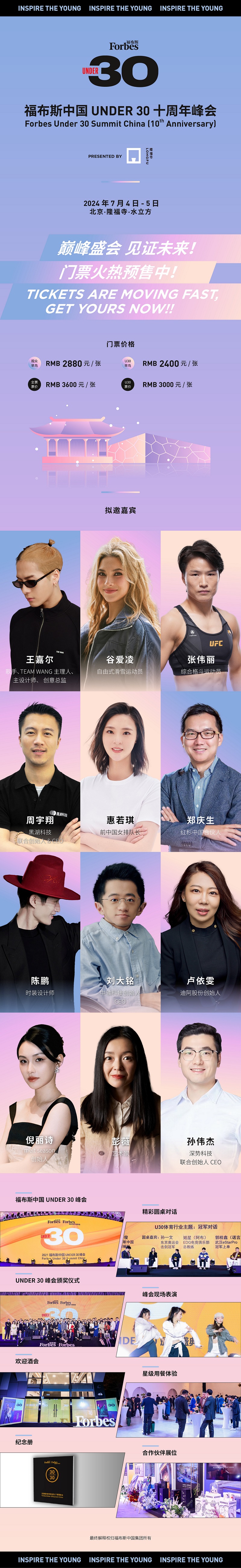 如今,一场充满着激情与智慧碰撞的U30盛会将再次拉开帷幕——2024年7月4日-5日,福布斯中国UNDER 30 十周年峰会开幕仪式及颁奖典礼将在北京隆福寺和国家游泳中心(水立方)举行。我们将为中国的年轻力量和大咖们提供一个更加开放、轻松且有价值的社交场景,让大家在为期两天的交流和学习中实现自我成长。