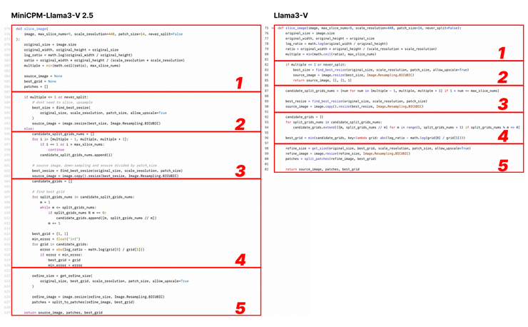 图左为 MiniCPM-Llama3-V 2.5,图右为 Llama3VLlama3-V 的代码是通过对 MiniCPM-Llama3-V 2.5 的代码进行格式调整和变量重命名得到的,包括但不限于图像切片方式、tokenizer、重采样器和数据加载:
