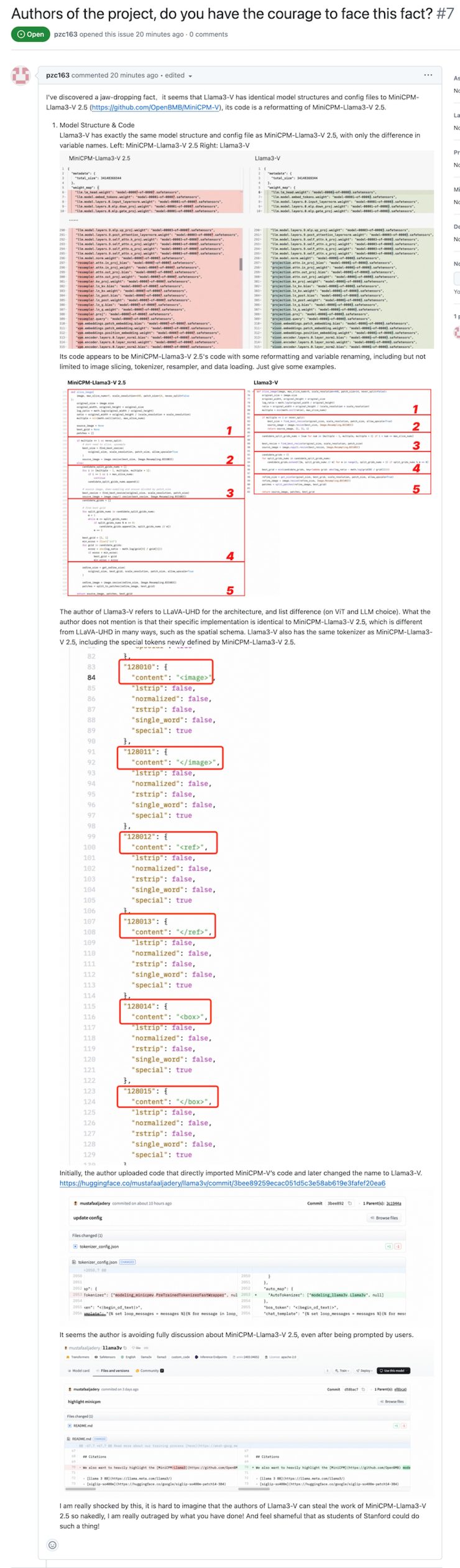 对此,Llama3V 团队回复,他们「只是使用了 MiniCPM-Llama3-V 2.5 的 tokenizer」,并宣称「在 MiniCPM-Llama3-V 2.5 发布前就开始了这项工作」。