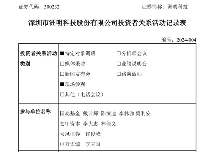 2024年5月29日-5月30日,深圳市洲明科技股份有限公司接受了国泰基金、玄甲资本、天风证券、申万宏源的特定对象调研,本次投资者关系活动以现场调研的方式进行,董事会秘书陈一帆 和投资者关系总监廖广南参与接待。