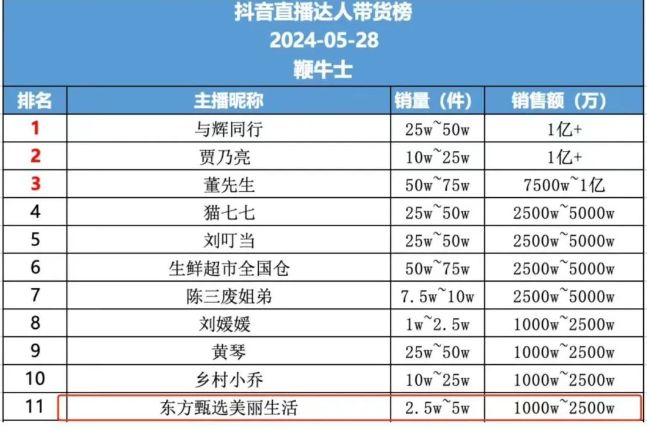 据统计,东方甄选在今年前3个月的销售额如下:1月为5.57亿元,2月仅为2.28亿元,3月回升至2.86亿元。与辉同行1月到3月的销售额分别为8.89亿元、4.50亿元、6.26亿元,远超同期的东方甄选。4月,与辉同行凭借5.8亿元位居抖音带货月榜榜首,东方甄选以1.9亿元排在第九位,东方甄选美丽生活则以1.6亿元排在第十位。