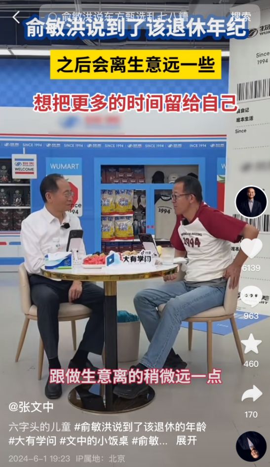 而此前,在物美创始人张文中的直播间,当张文中表示要向东方甄选董事会主席、行政总裁俞敏洪学习直播带货经验时,俞敏洪自嘲:“东方甄选现在也做得乱七八糟,没有任何向你提建议的本领。”俞敏洪称要将更多的时间留给自己,跟做生意离得稍微远一点。
