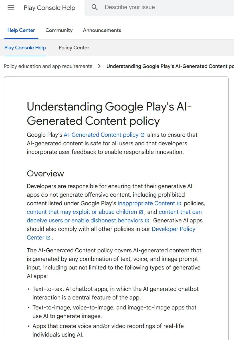 谷歌 Play 明确,AI 生成的违规内容包括不限于如下案例: