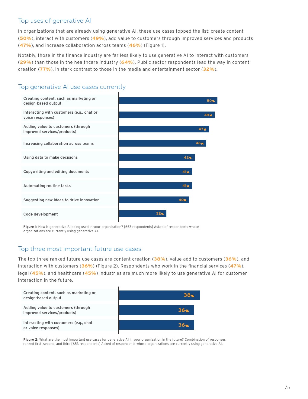 排名前三位的未来用例是内容创建(38%)、为客户增值(36%)和与客户互动(36%)。在金融服务(47%)、法律(45%)和医疗保健(45%)行业工作的受访者更有可能在未来使用生成式人工智能进行客户互动。