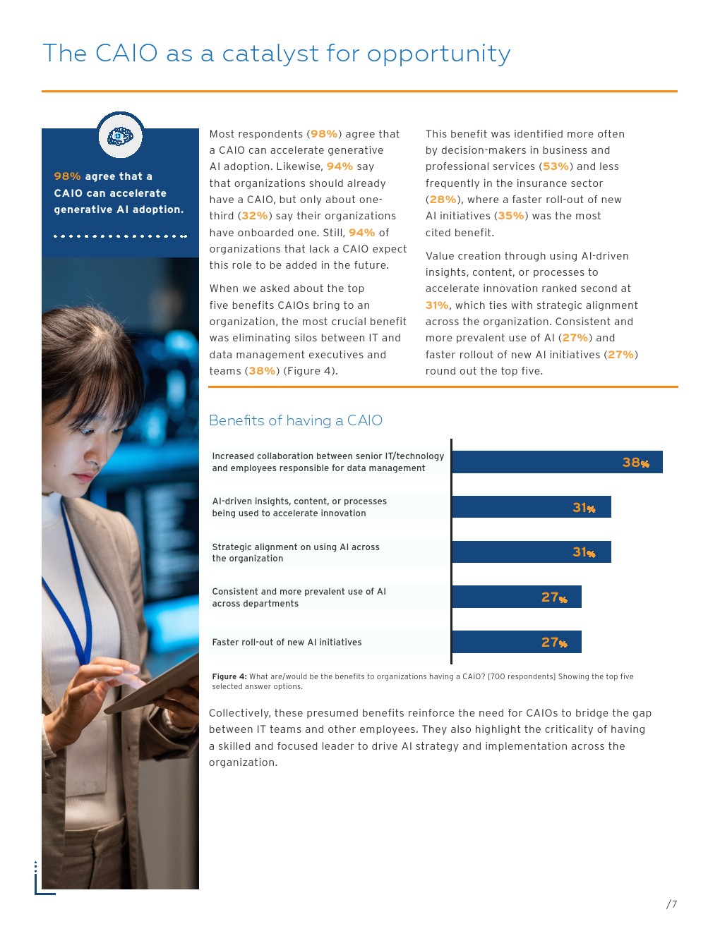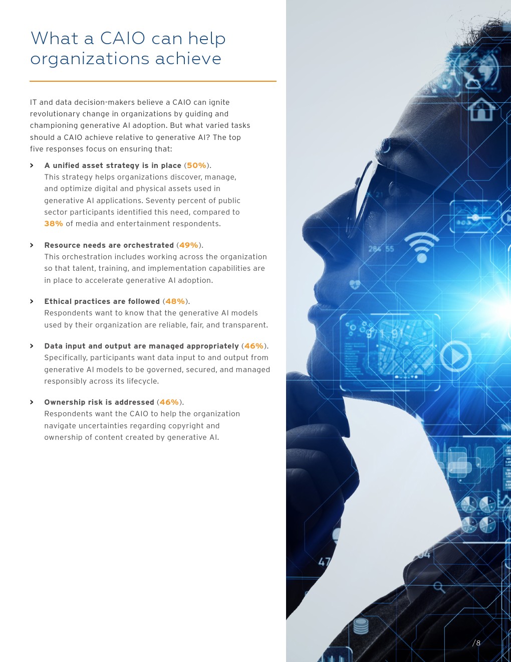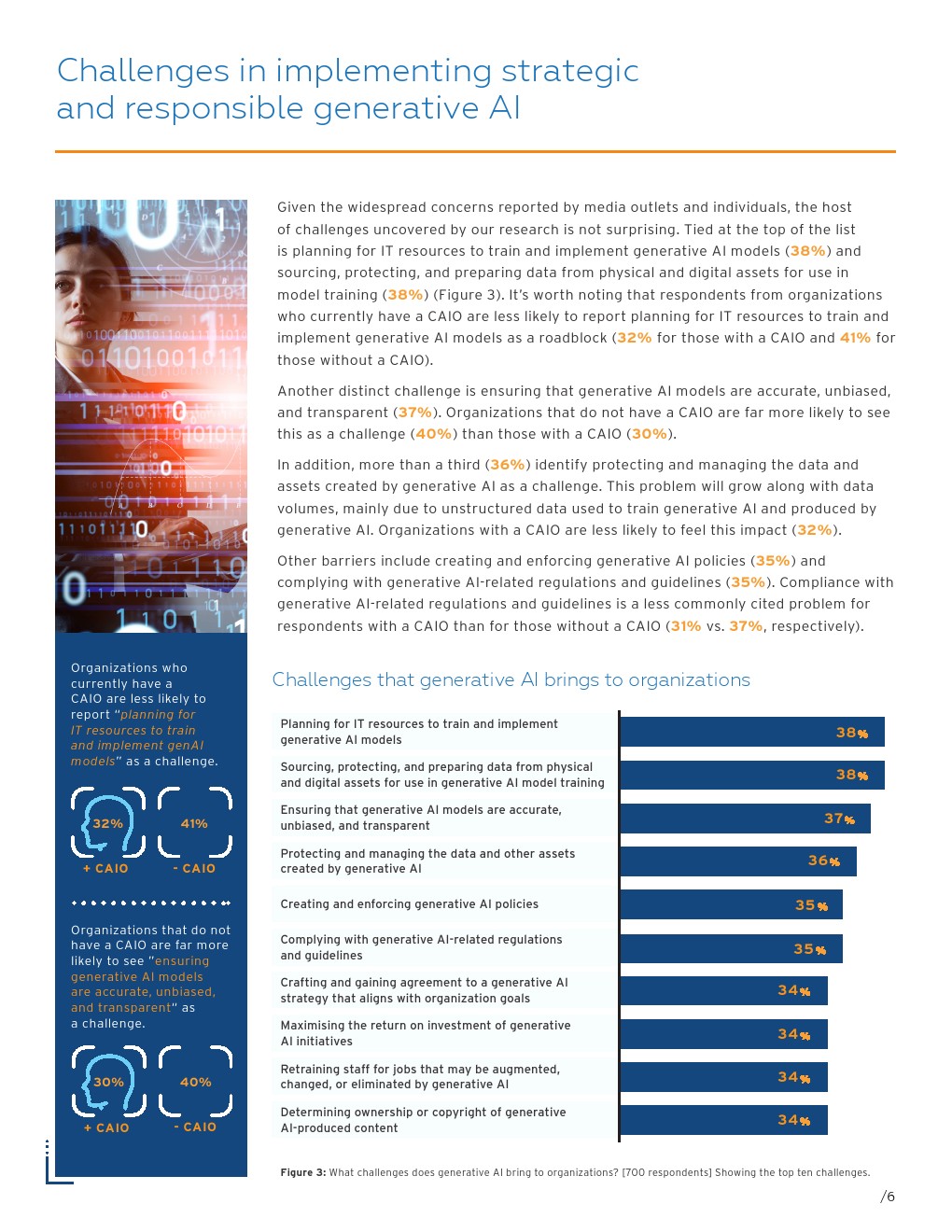 这项研究调查了六个国家的700名IT和数据决策者,大多数受访者(93%)所在的组织已经以某种方式使用生成式人工智能。虽然大多数人(98%)认为CAIO可以进一步加速生成式人工智能的采用,但目前只有32%的组织拥有CAIO。预计94%的组织计划在未来拥有CAIO。与此同时,绝大多数受访者(96%)认为,管理数字和实物资产的统一资产战略对生成式人工智能计划的成功至关重要。