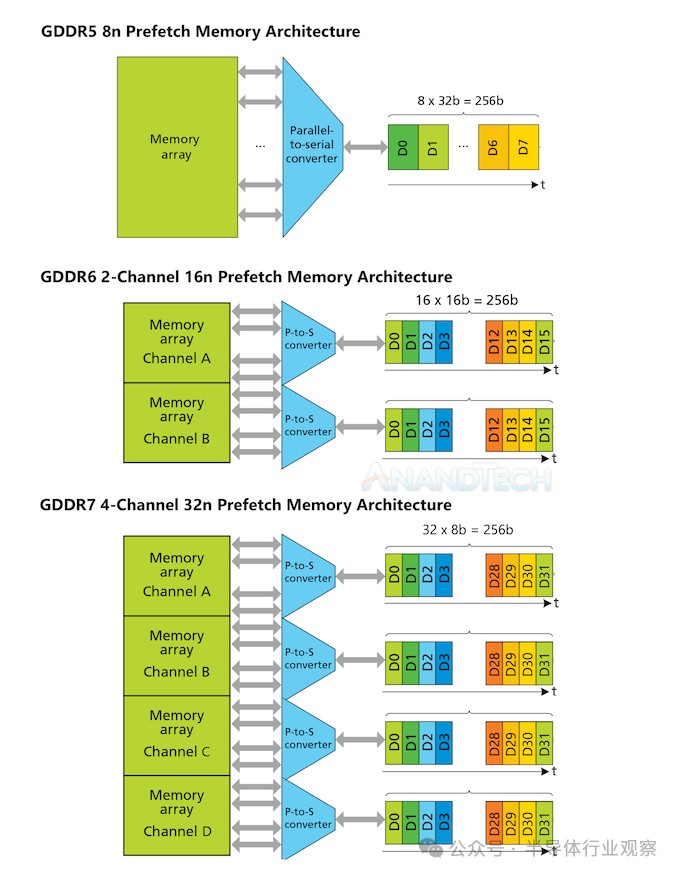 图表展示了GDDR7相对于前几代在带宽、功耗和封装上的显著改进。来源:anandtechGDDR7最大的技术变化在于内存总线从2位不归零 (NRZ) 编码转换为3位脉冲(-1、0、+1)幅度调制 (PAM3) 编码。PAM3使GDDR7能够在两个周期内传输3位数据,仅这一变化就让数据传输效率提高了50%。随着向PAM3信号的转变,内存行业有了一条新途径来扩展 GDDR 设备的性能并推动图形和各种高性能应用的持续发展。