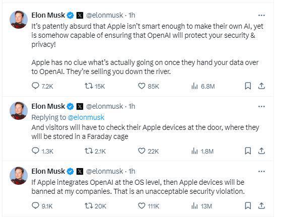 与ChatGPT生成式AI聊天机器人背后母公司OpenAI矛盾重重的特斯拉CEO马斯克不干了,他在旗下社交媒体X(即前推特平台)上频繁发贴警告苹果不可将ChatGPT整合入操作系统: