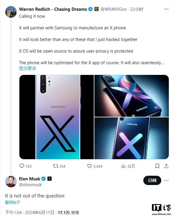 周一,一位 X 平台用户发推文预测马斯克将打造一款 X Phone,马斯克对此回复称,“这并非不可能”。