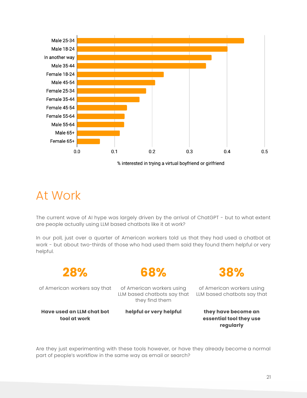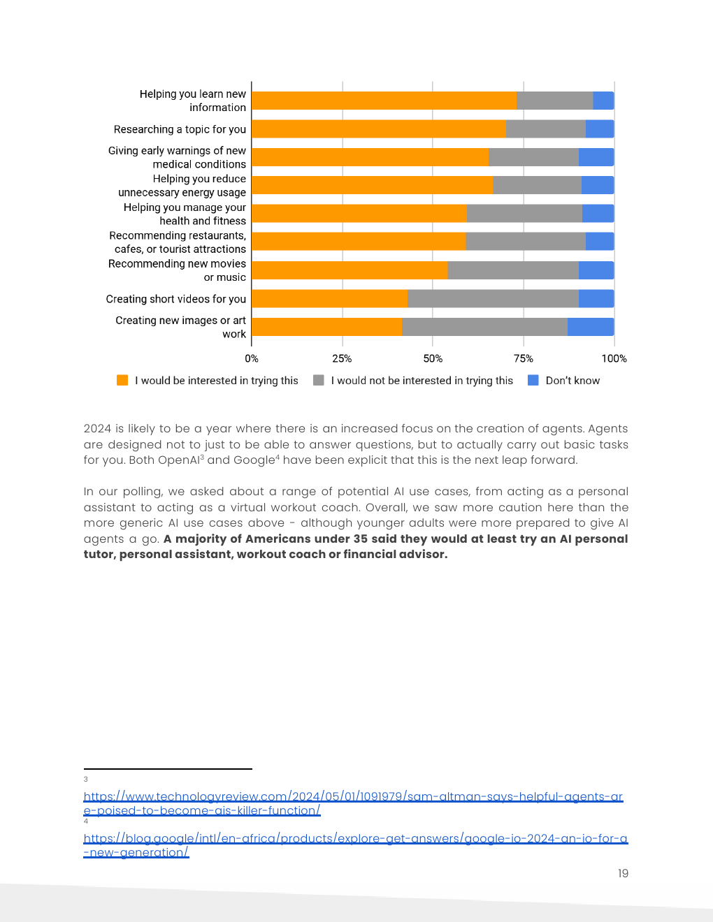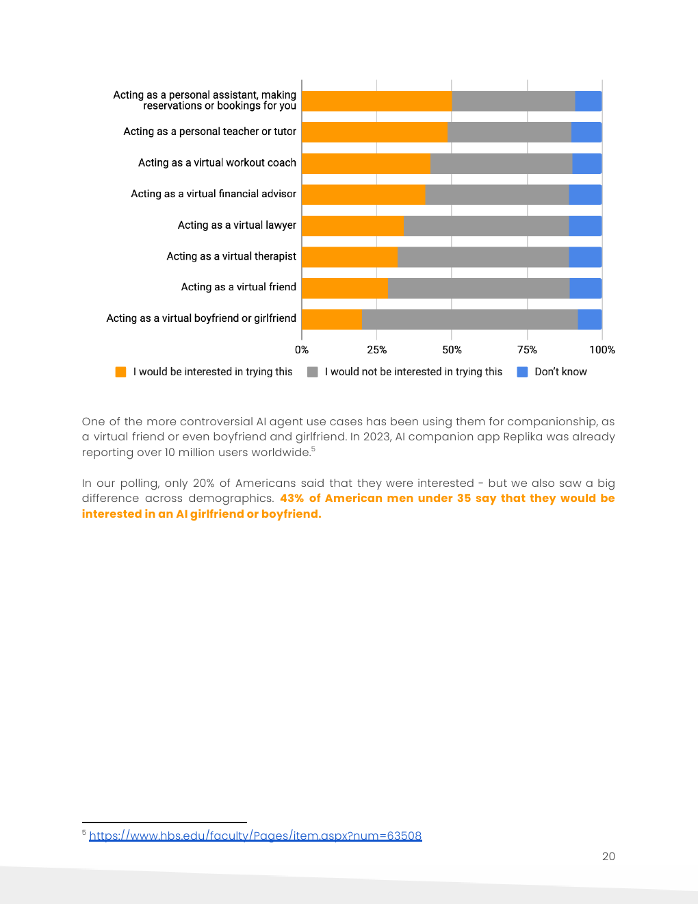 大多数35岁以下的美国人表示,他们有兴趣尝试人工智能私人导师、私人助理、健身教练或财务顾问。43%的35岁以下美国男性对人工智能女友或男友感兴趣。