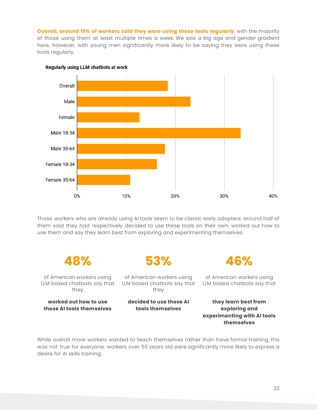 在使用LLM聊天机器人的美国员工中约有一半表示,他们自己学会了如何使用这些工具。36%的人对正式培训感兴趣。
