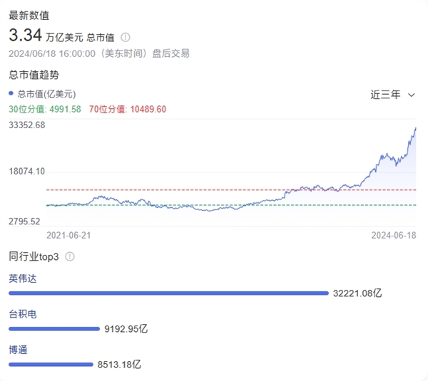 更令人吃惊的是,英伟达市值从2万亿美元升到3万亿美元用了96天。