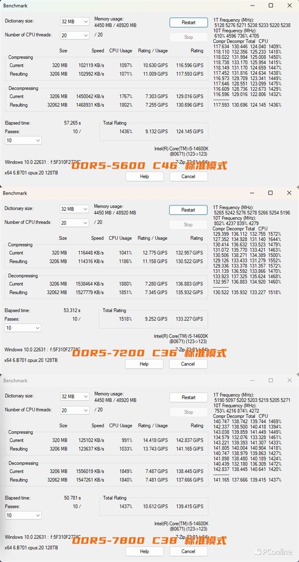 实测在默认5600MHz频率时,压缩测试得分为117.593 GIPS,解压缩测试得分为130.696 GIPS,整体测试得分为124.145 GIPS。开启XMP后,你会发现,分数还能进一步提升到压缩130.522 GIPS,解压缩135.932 GIPS,总分133.227 GIPS,提升幅度相当明显。