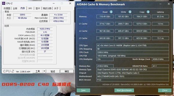 紧接着我们继续超频,不过事实证明在8000MHz的基础之上要再超频是一件比较困难的事情,我们在多番尝试之后把手上这套芝奇Trident Z5 Royal DDR5-7200 24GB*2内存以CL-40-52-52-130的时序超频至8200MHz。此时的读取性能提升到了116.49 GB/s,性能释放又猛了不少,相比标准模式的8000MHz略有提升。