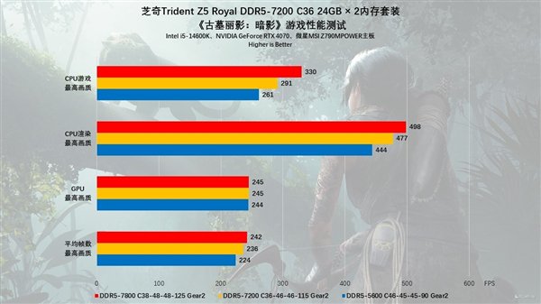 接着是玩家心心念念的游戏测试,我们测了老牌的3A游戏《古墓丽影:暗影》,在默认的5600MHz下,实测1080P画质能够跑到224 FPS。在开启XMP-7200MHz后,游戏帧数能够突破236 FPS,相比默频提升了约10 FPS。超频至7800MHz下,游戏平均帧可以来到242 FPS,提升了20 FPS左右。这个成绩足以证明高频的D5内存确实能够显著提高游戏体验。