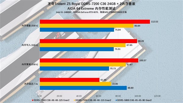 如果你将频率提升至DDR5-7800MHz这样的高频下,再配合C38的时序,那成绩真的离谱,此时已经能看到GB/s的单位了。读取112.53 GB/s,写入101659 MB/s差点突破100 GB/s,复制则有100.57 GB/s,延迟更是仅为61ns,可以说这个表现在高频DDR5内存里已经是鹤立鸡群的存在了。