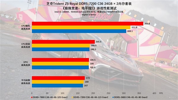 紧接着给大家带来《地平线5》的测试数据。在默认的5600MHz下,1080P画质运行《地平线5》的基准测试,测得CPU渲染为188 FPS,CPU模拟为308 FPS。拉升到7200MHz后,CPU模拟与CPU渲染可以上涨至190FPS和322FPS。