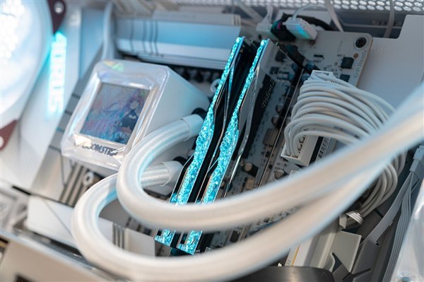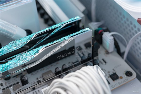 不得不说,芝奇Trident Z5 Royal DDR5 内存的导光条设计,独具匠心。上机点亮以后,导光条晶莹剔透,犹如水钻般璀璨夺目。