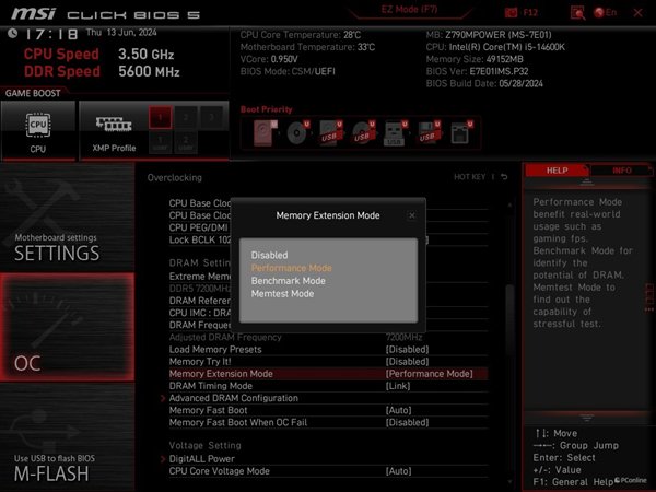 另外,值得一提的是微星Z790MPOWER主板的BIOS中提供了Memory Extension Mode功能,可以一键提升内存性能,并且这个Mode有三种模式,分别是性能模式、基准模式和内存测试模式,可以形象的认为是一、二、三档,档位越大对于内存的调整会越猛,但相对应的内存稳定性下降。