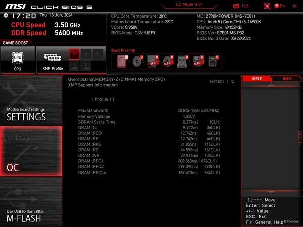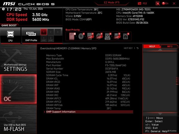 在BIOS中我们可以对这款内存进行一个初步的了解,例如内存包含一个默认的JEDEC-5600MHz以及XMP-7200MHz。
