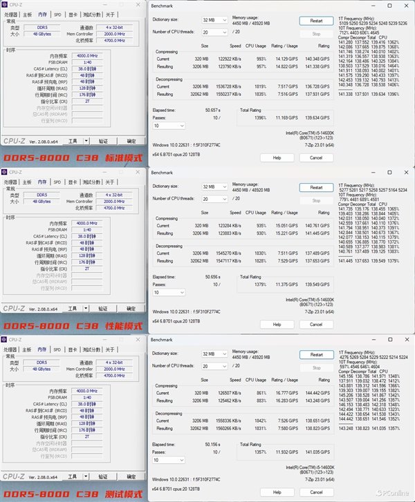 7-Zip内,测试模式的表现也比标准模式或性能模式更优,整体评分由139 GIPS增长到141 GIPS。
