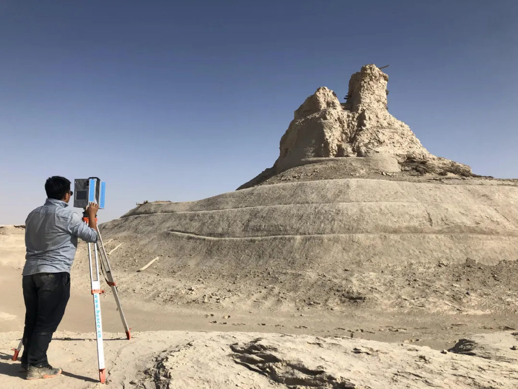 中铁文保技术员在对楼兰古城佛塔遗址进行数据采集。