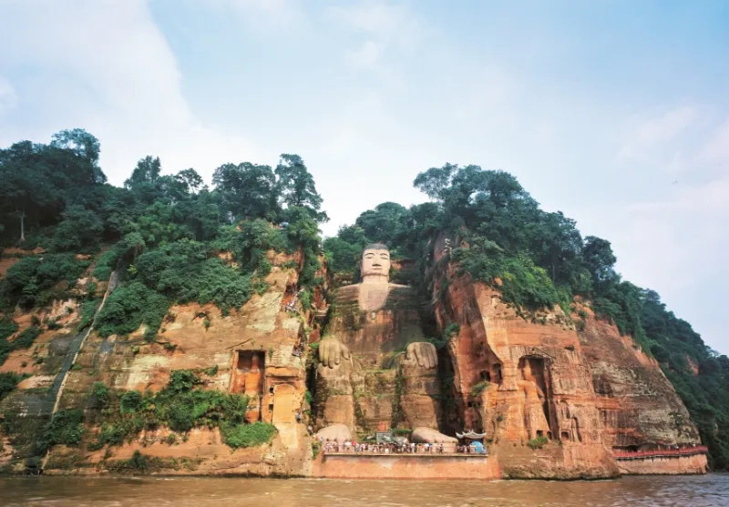 大渡河、青衣江和岷江三江交汇处,坐落着有1300年历史的乐山大佛像。它通高71米,依山凿成,临江危坐,神势肃穆,大气磅礴。