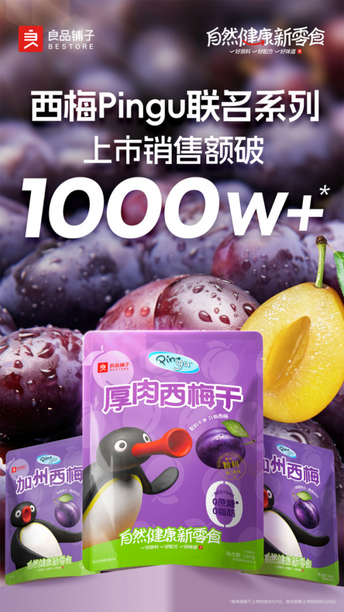 6月21日,良品铺子“西梅家族Pingu联名系列产品”战报出炉,厚肉西梅干、加州西梅持续热卖,销售额突破1000万元,成为零食市场的新晋热门零食单品。“联名”、“自然健康”,是这款产品的两大独特标签。这也是良品铺子本月的第二个破千万的单品,以“新鲜土豆原料、工艺首创非油炸和饱腹低负担”的酥脆薄饼此前已破千万。