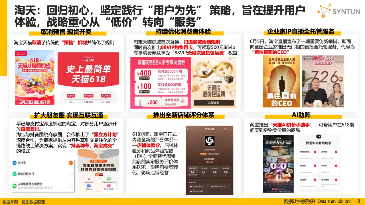 今年的“618”电商节延续了“低价之争”, 比价跟价更为激烈,各平台以极限低价策略争夺消费者的”心”;同时“聚焦用户体验”、“用户为先”的理念也被各大平台高声呼喊,这标志着在激烈的低价竞争环境下,各平台正将战略重心回归到用户服务,更加注重用户体验的提升。