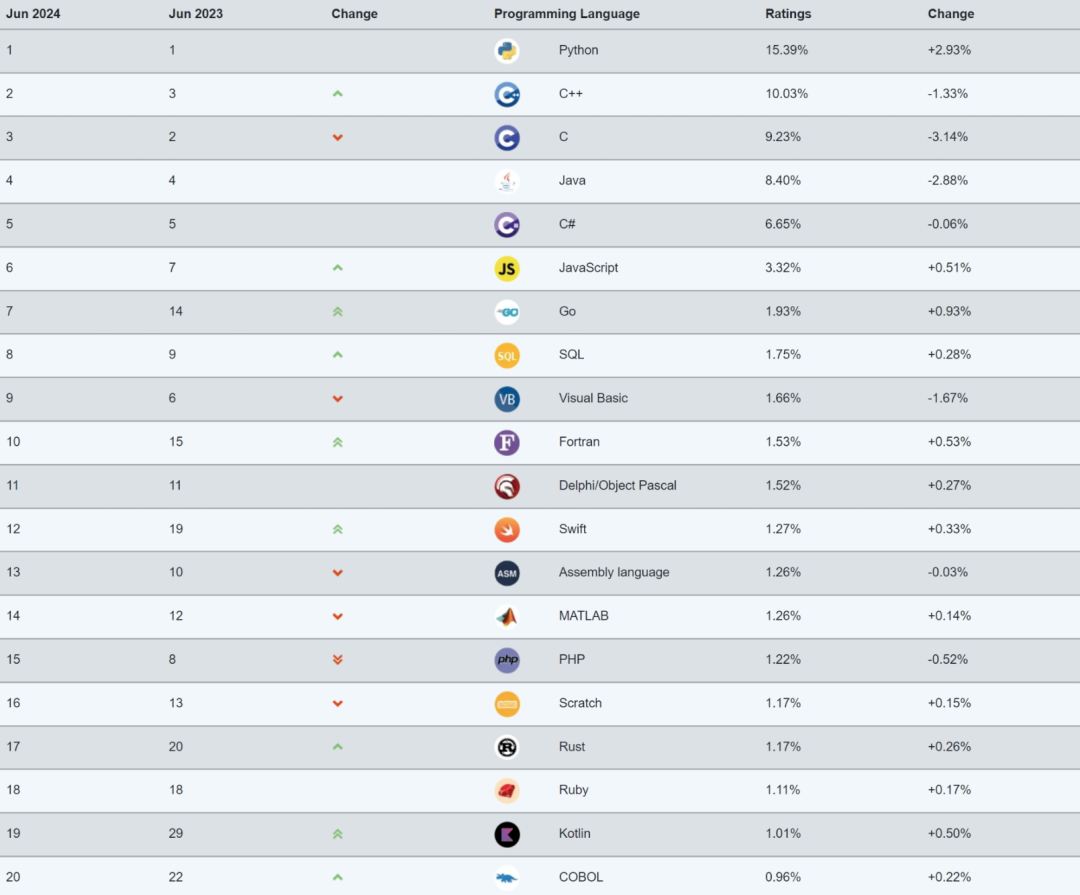 除了 C++ 首度超越 C 语言,本月榜单中还有 2 个编程语言也达到了名次新高:Go 首次排名第 7,第 17 位的 Rust 也刷新了自身历史新高。
