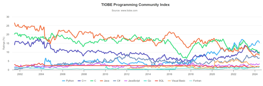 此外,附上 Top 10 编程语言 TIOBE 指数走势(2002-2024):