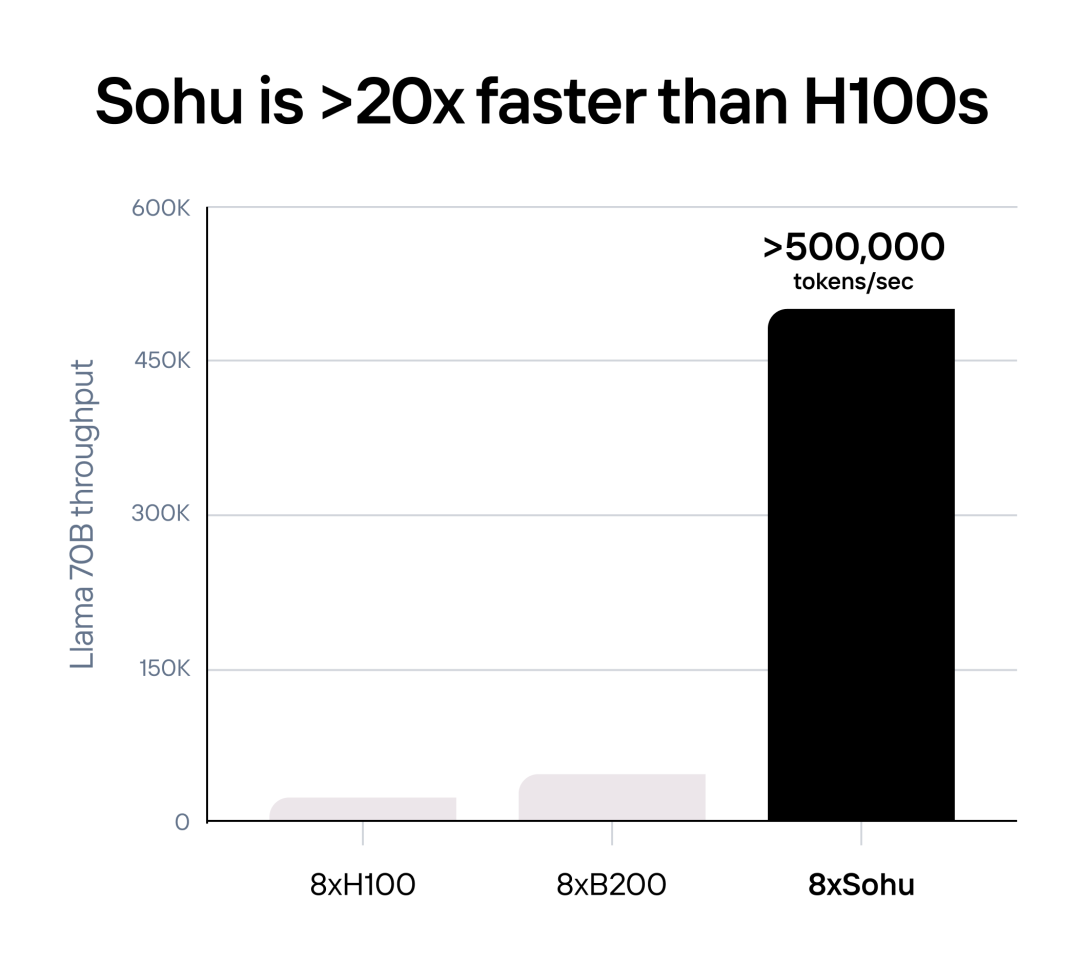 一台 Sohu 的服务器运行 Llama 70B 每秒可输出超过 50 万个 token,比 H100 服务器(23,000 个 token / 秒)多 20 倍,比 B200 服务器(约 45,000 个 token / 秒)多 10 倍。