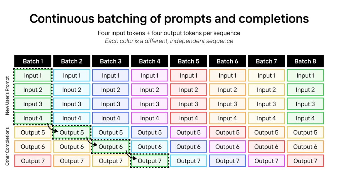 以下为 LLM 连续 batching 处理的示例,这里运行具有四个输入 token 和四个输出 token 的序列。每种颜色代表不同的序列。