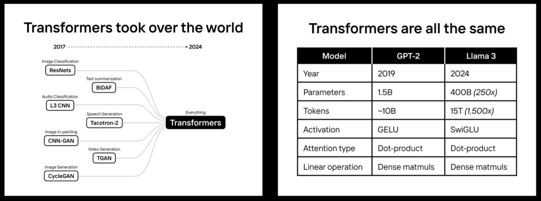作为一个新兴领域,AI 模型的架构过去变化很大。但自 GPT-2 以来,最先进的模型几乎都在使用 Transformer,从 OpenAI 的 GPT 系列、谷歌的 PaLM、Facebook 的 LLaMa,再到特斯拉 FSD 自动驾驶所需的模型。