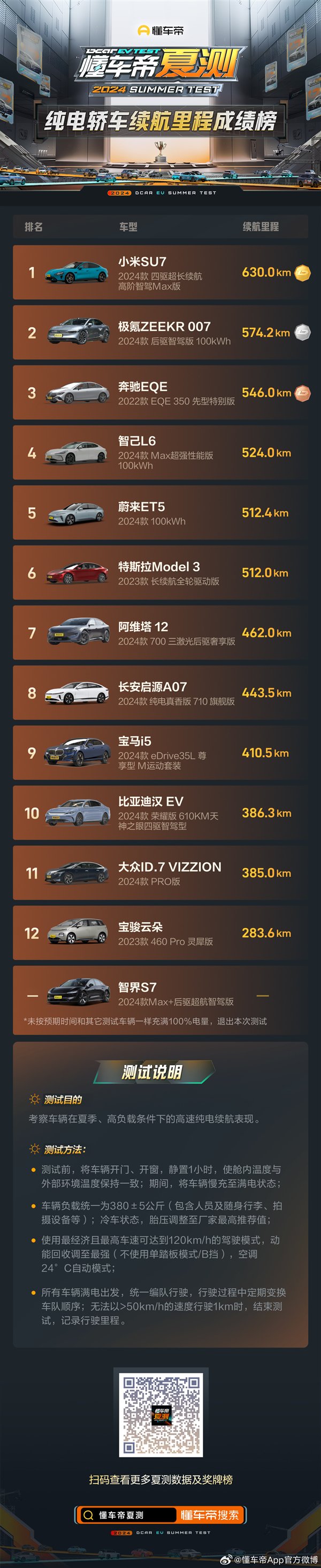 其中,纯电轿车续航里程成绩榜中,小米SU7四驱超长续航Max版实测续航里程630km,排名榜单第一。