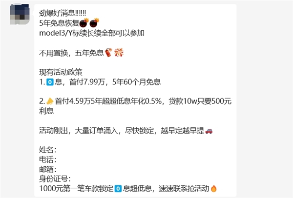 目前,特斯拉销售已经向潜在客户群发该消息,并称“活动刚出,大量订单涌入,尽快锁定,越早定越早提”。