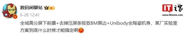结合此前的报道来看,这款实验室新机预计来自小米旗下。另一位博主 @数码闲聊站 同样透露过一款神秘“实验室方案”新机的配置信息,据称采用“全域高分屏下前摄 + 去掉压屏条极致 BM 黑边 + Unibody 全陶瓷机身。”