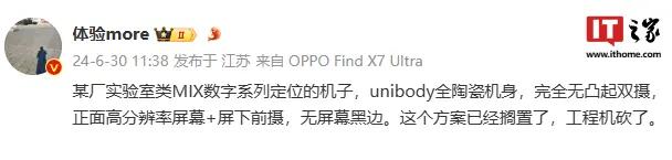 6 月 30 日消息,据博主 @体验more 今日爆料称,某厂实验室类 MIX 数字系列定位的机子采用“Unibody 全陶瓷机身、完全无凸起双摄、正面高分辨率屏幕 + 屏下前摄、无屏幕黑边”。目前,这个方案已经搁置了,工程机“砍”了。