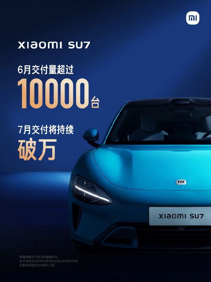 7月1日,小米汽车官方微博发布了最新消息。根据官方数据显示,2024年6月小米SU7的交付量超过了10000辆,并且预计7月份的交付量将继续突破一万。这是小米汽车在5月份交付8630辆、4月份交付7058辆之后,再次取得的重大进展。