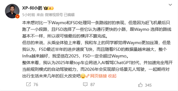 何小鹏认为,尽管Waymo提供的乘坐体验更加流畅,但特斯拉FSD在过去半年中的快速进步令人瞩目。