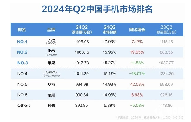 市场调研机构披露的数据显示,2024年Q2(W14-W26),iPhone的激活量仅为1017.73万台,同比下跌1.88%,位列第三。vivo以1195万台激活量排名榜首,同比增长7.17%。